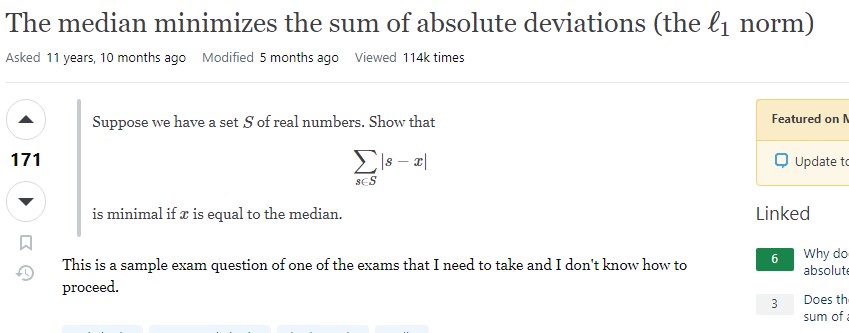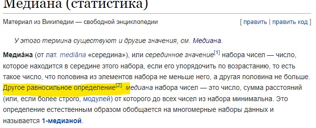 И напротив, если мы для упорядоченного конечного множества чисел (величин, значений) найдем число, удовлетворяющее условию, что сумма модулей разности между этим числом и членами множества будет минимальной, то половина членов множества будет больше или равна этому числу, а половина - меньше или равна этому числу.
