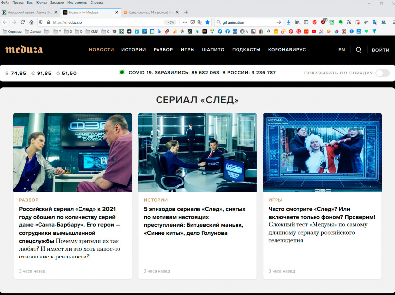 Зашел сегодня в "Медузу", а там на всю главную страницу на самом козырном месте аж три статьи в трех разных разделах (нерекламных, замечу), посвященные российскому сериалу "След". Что за "След", спросите вы? Это очень жалкая попытка сделать российскую перепевку известнейшего сериала "CSI: Место преступления". Нудят они с этим сериалом аж с 2007 года, рейтинг на "Кинопоиске" - 4,7, в отзывах зрители не скупятся на теплые матерные слова.