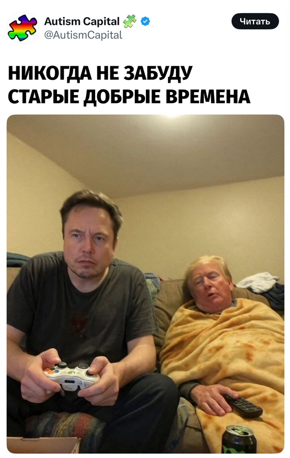 «Трамп заявил, что самый простой способ сократить траты бюджета — расторгнуть все государственные контракты с Илоном Маском. Комментарии Трампа так взволновали Джеффа Безоса, что его ракета выросла на шесть дюймов.
