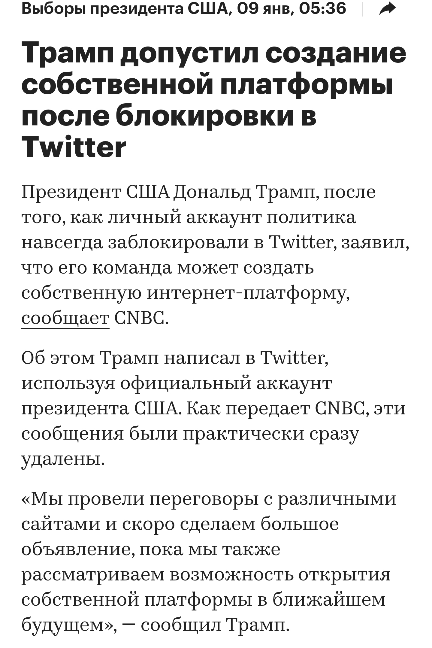 Но кроме этого есть и еще одно соображение. До проигрыша выборов Трампа никогда не банили в соцсетях, более того, насколько я понимаю, для него были особые правила, обычного человека за те же высказывания забанили бы давно. Соответственно, за что борьба? Добровольно ограничивать свою аудиторию чтобы что?