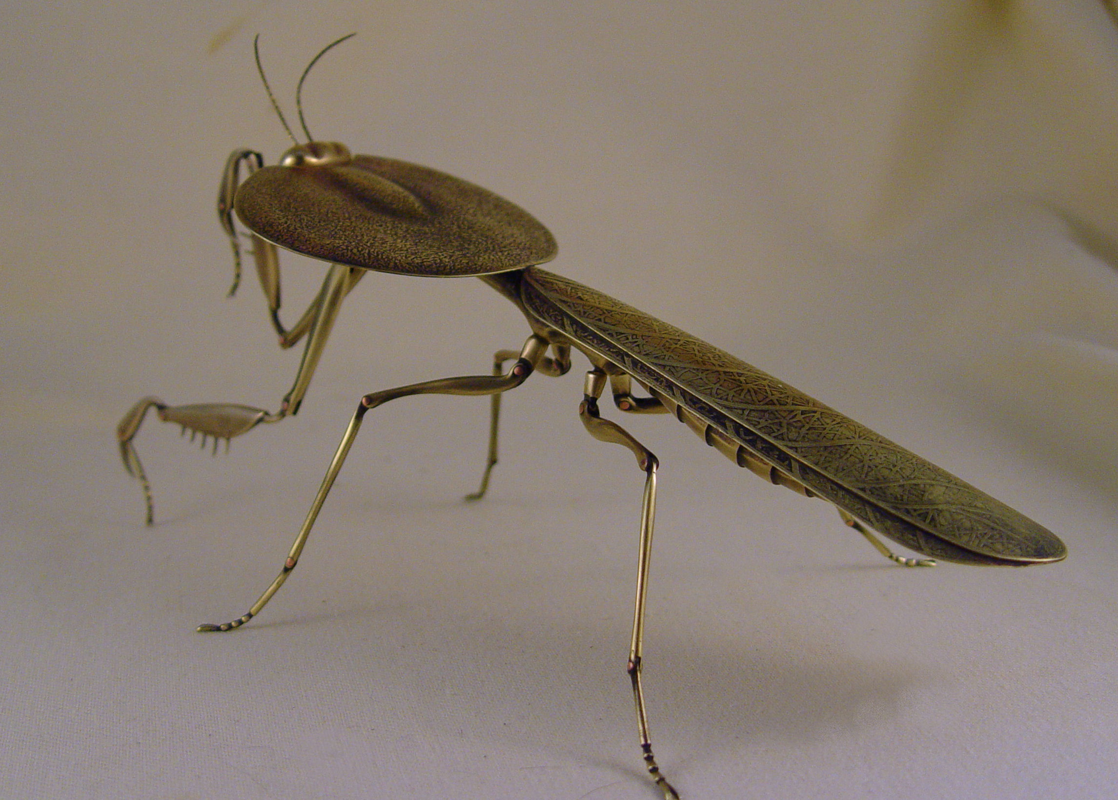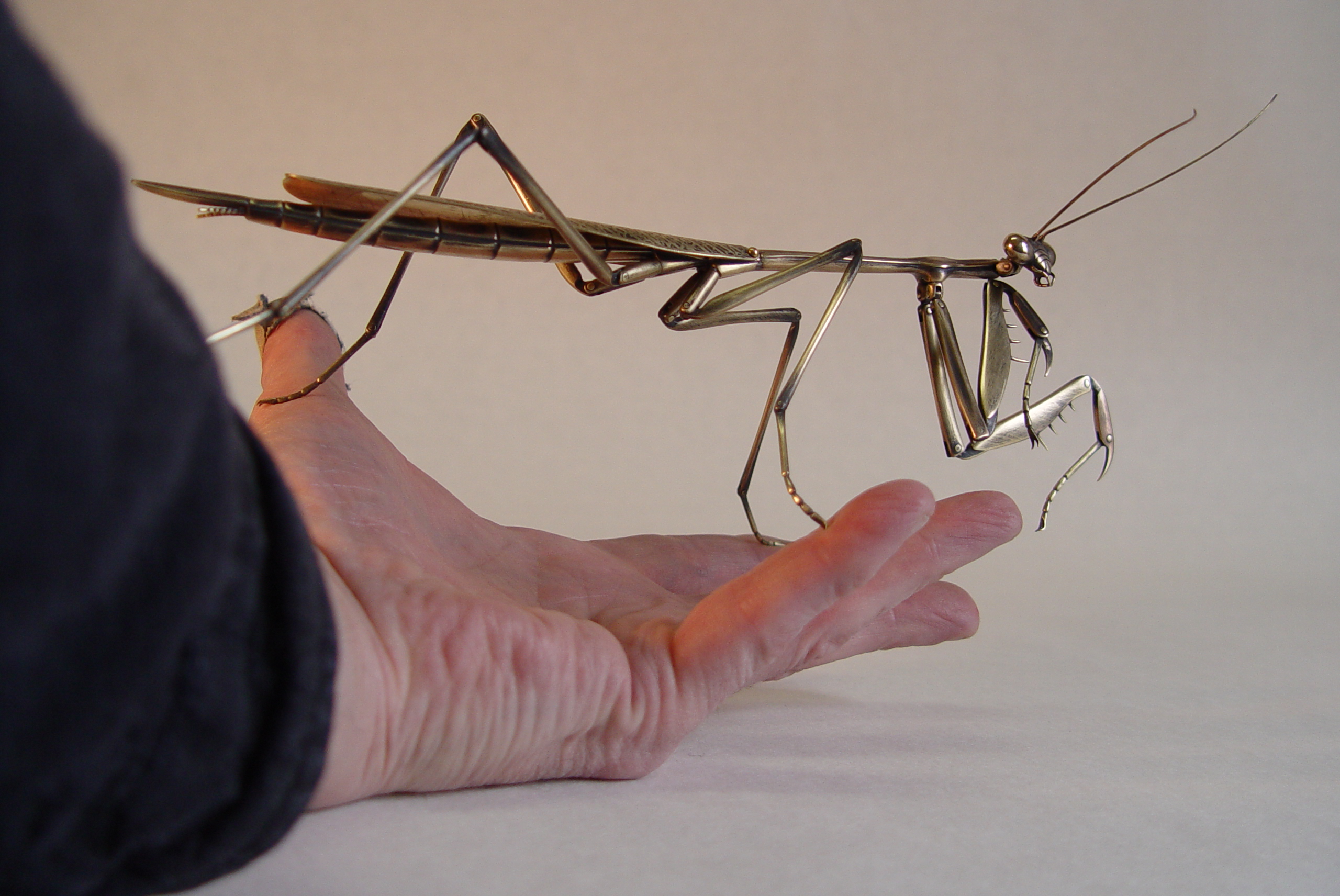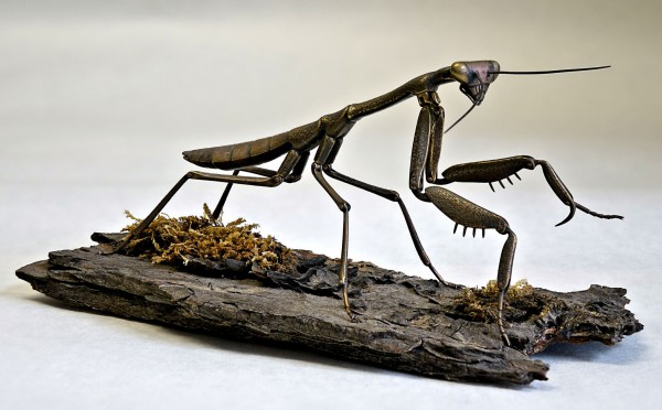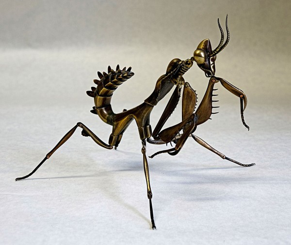 Страсть художника Джоффри Хабермана - богомолы, фигурки которых он создает из латуни. Все делается строго вручную: Джоффри использует латунные полосы и листы, узоры и мелкие детали протравливаются хлоридом железа. Фигурки, кстати, немаленькие, размером с ладонь. Соединения сделаны на шарнирах.