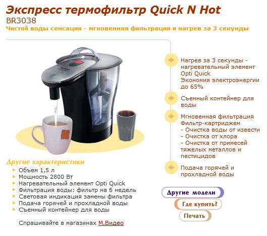 Судя по всему, оно отмеряет и быстро нагревает проточную (из своей большой емкости в подставленную чашку) воду. Это работает, если нужен кипяток, но если хочешь, допустим, 80 градусов (для растворимого кофе или детской смеси), получишь некипяченую? Я правильно понимаю?