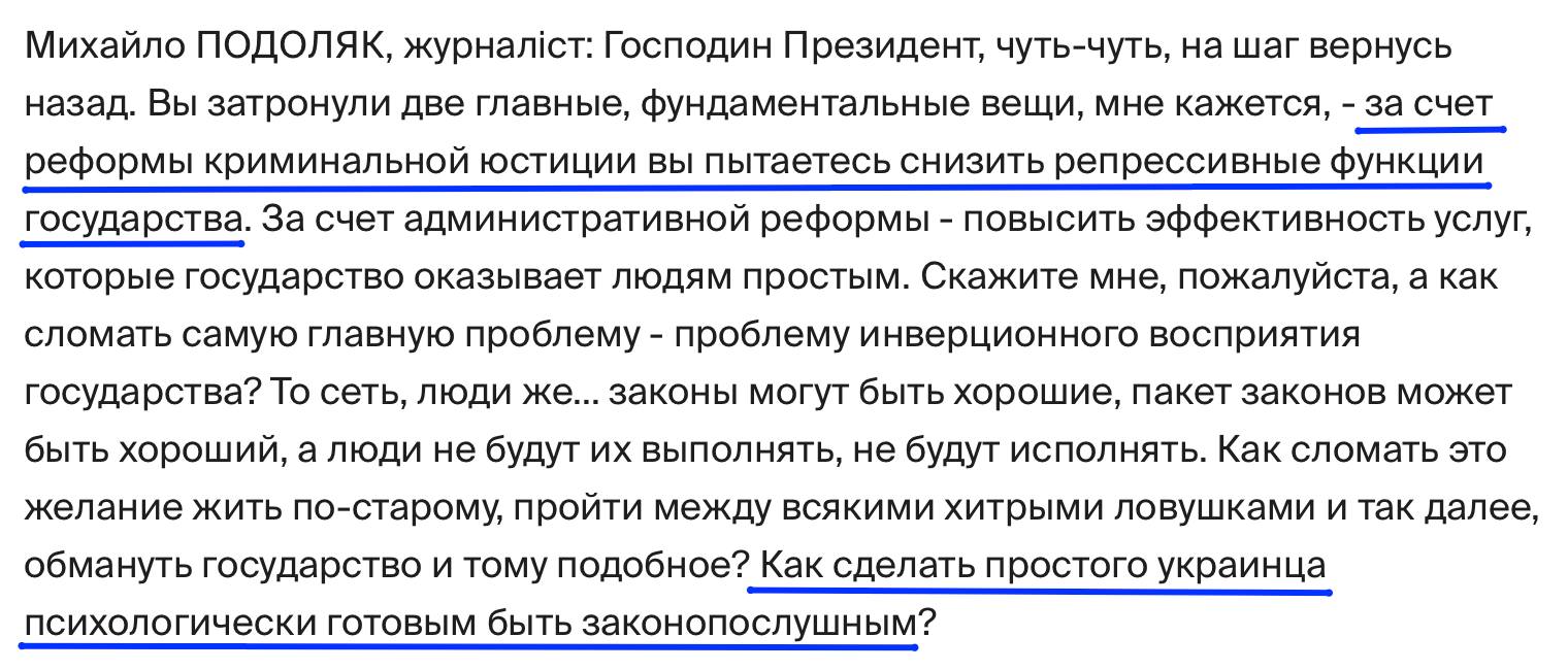 Цитаты Михаила Подоляка. А вот это - его вопрос Януковичу на интервью в Межигорье 28.06.2011. Ирония еще и в том, что это интервью было через четыре дня после того, как начался заказной суд над Тимошенко, по итогам которого ее посадили и выпустили уже после бегства Януковича в 2014.