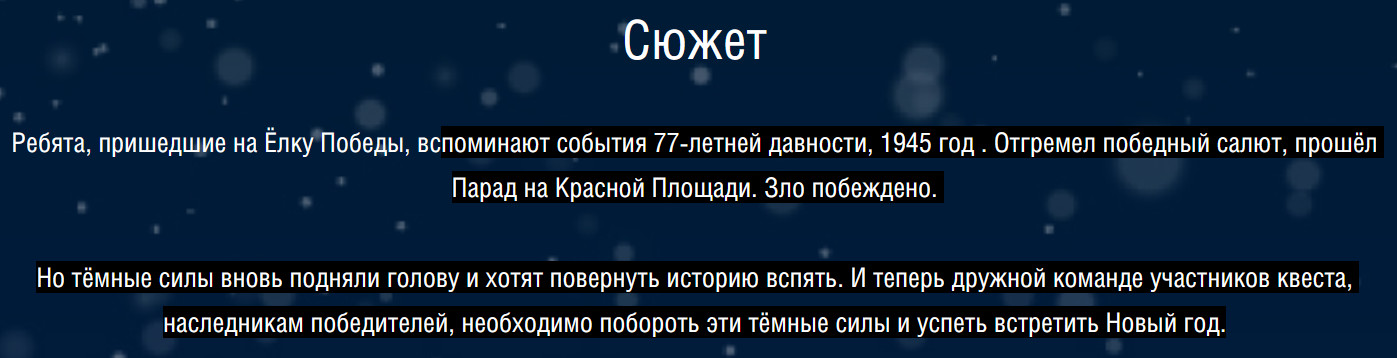 "В финале отважные ребята встретятся с Дедом Морозом и зажгут, как и их героические прадеды, Ёлку Победы!"