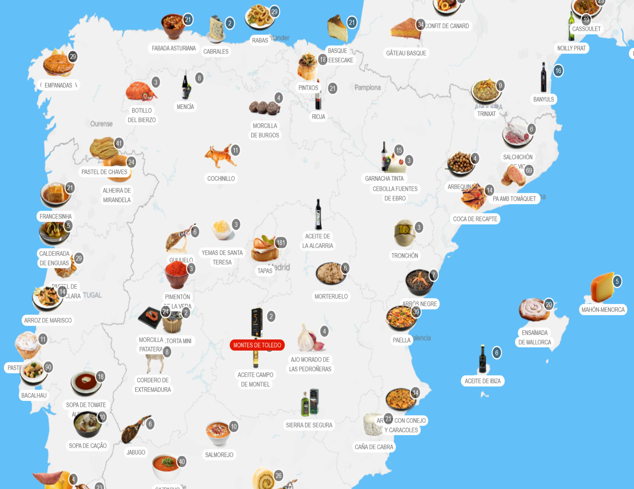 Карта масштабируется до определенного уровня, так что можно посмотреть основные блюда по регионам одной страны. Вот, например, часть Испании.