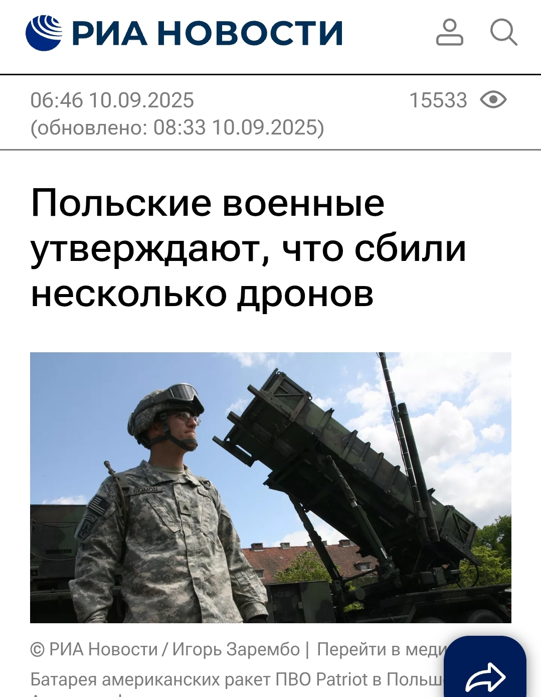 Версия «случайных залетов» выглядит уж очень бледно: русских боевых дронов много и они не в километре от границы, а над Варшавой, Цехановом, Люблином и т.д.