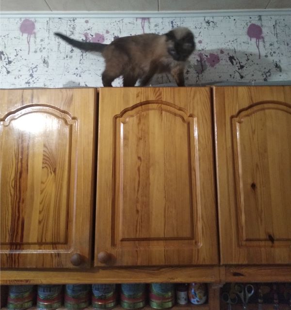 У нас шкафы в кухне встроенные, до потолка, но кошке оставили свободную полку наверху и она иногда там сидит, следит за порядком 😄