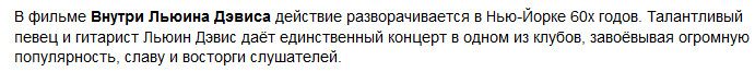 Вот, например, анонс оттуда к фильму Коэнов "Внутри Льюина Дэвиса" (я рецензию на завтра пишу). Кто фильм смотрел - тот протащится.