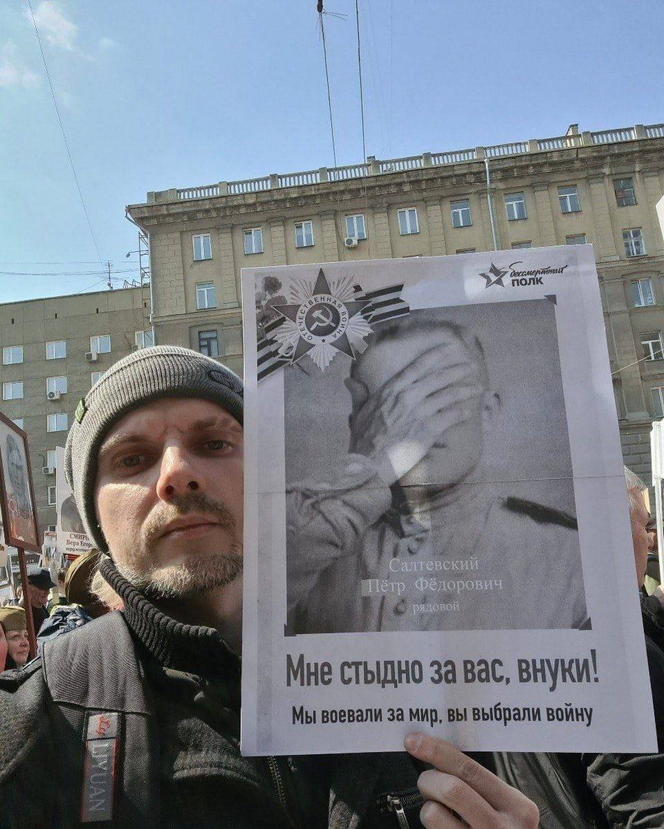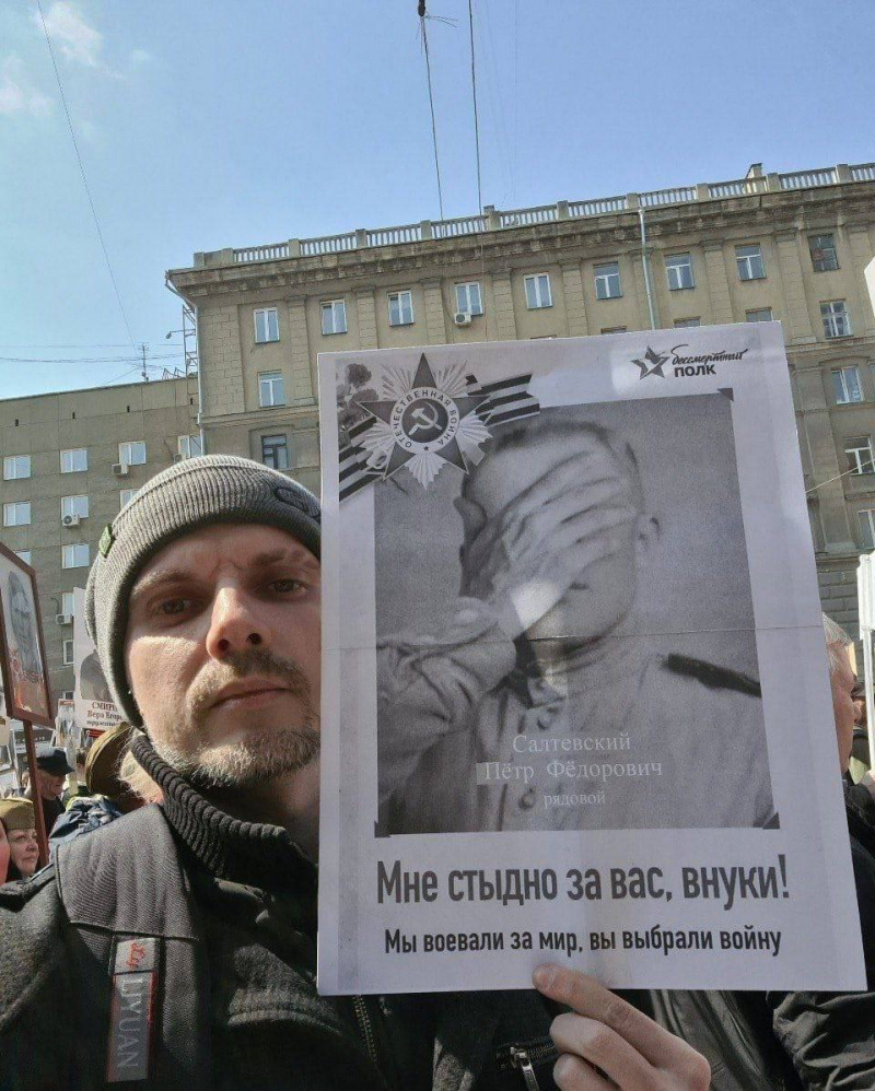 Он вышел с плакатами «Мне стыдно за вас, внуки» и «Победили тот фашизм, победим и этот». (Отсюда.)