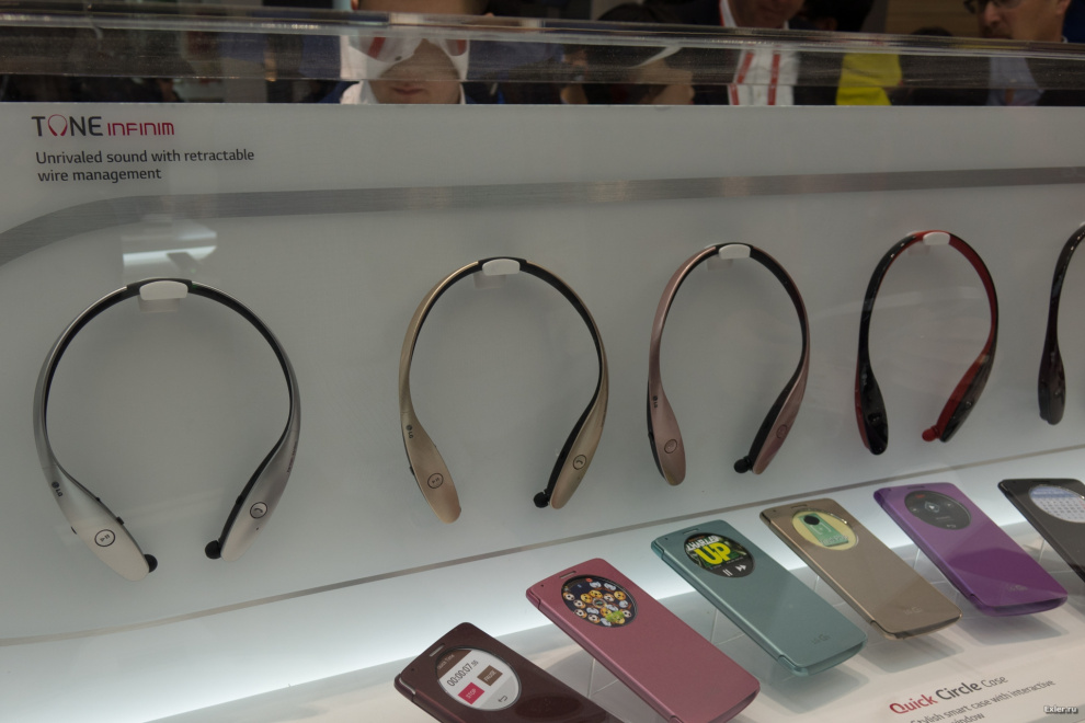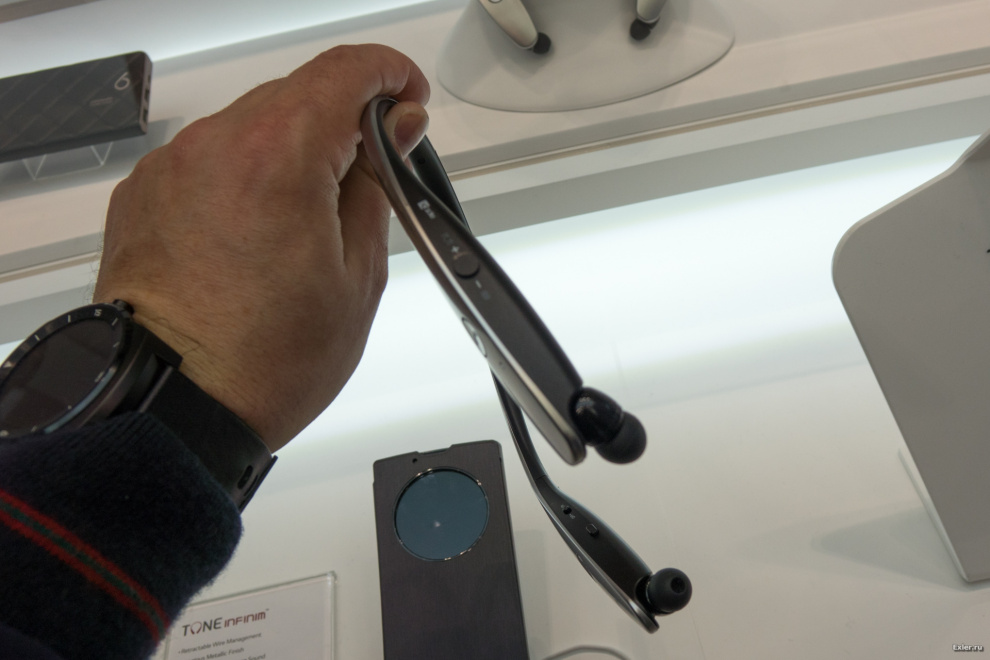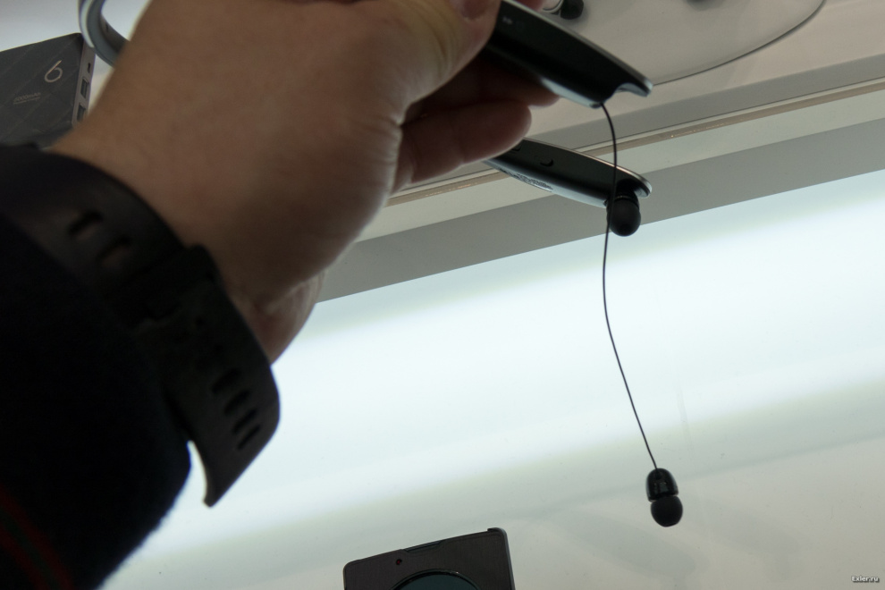 Гарнитура носится на шее, наушники-вставки вытягиваются из нее на проводках. На самой гарнитуре - всякие элементы управления. Утверждается, что там отличное качество звука - даже по BT. Как-нибудь протестирую, на выставке слушать качество звука - занятие безнадежное.
