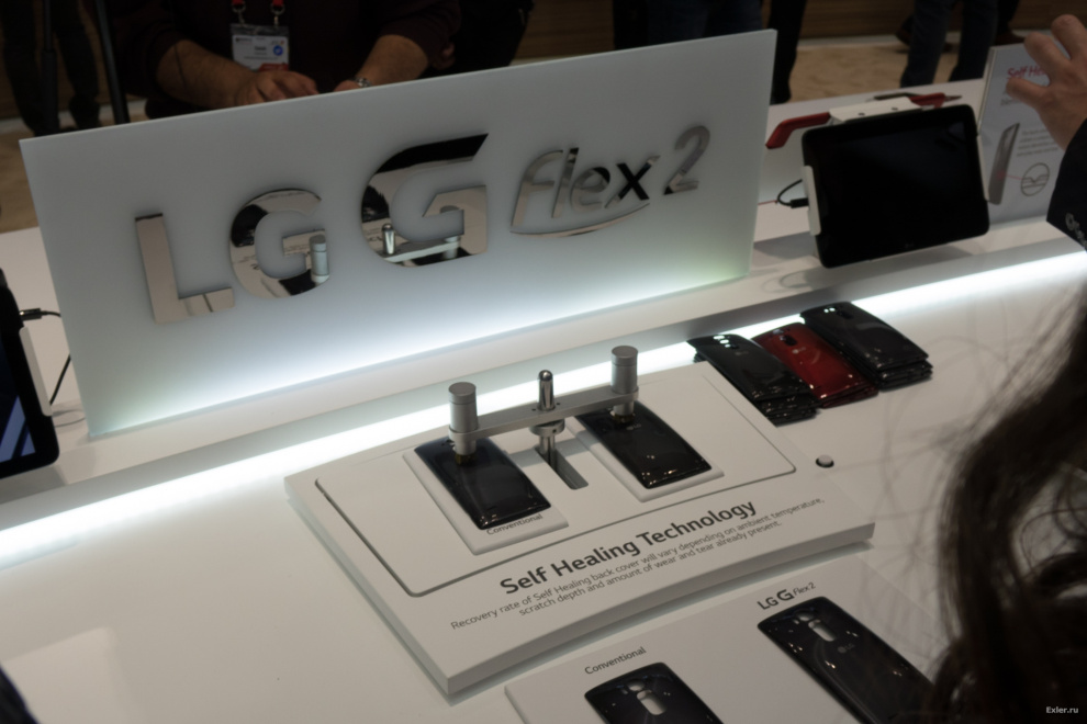 Одна из особенностей первого Flex - якобы самовосстанавливающаяся поверхность задней крышки. Ну, то есть оно не якобы, на стенде можно было посмотреть, как мелкие (очень мелкие) царапинки, наносимые на крышку, действительно заживляются минуты за три.