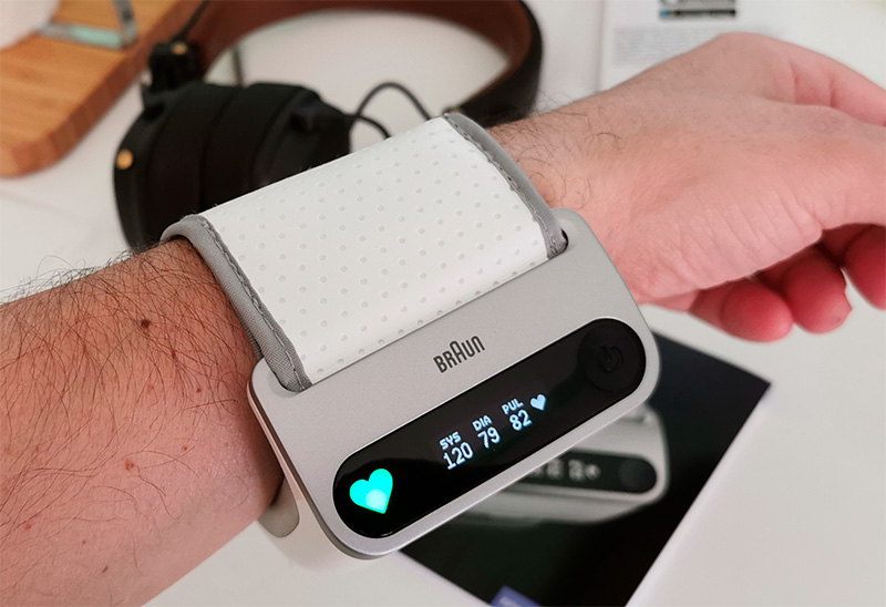 Он с манжетой, надевается на запястье и руку нужно держать в определенном положении, причем умное устройство само определяет, правильное ли положение и дает подсказку, как правильно расположить руку.