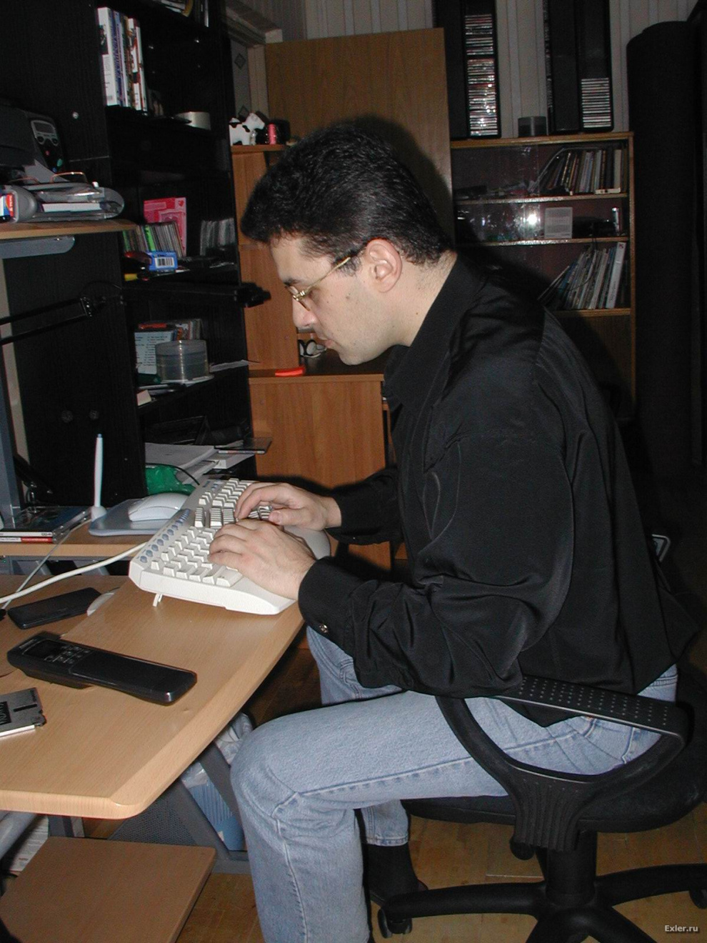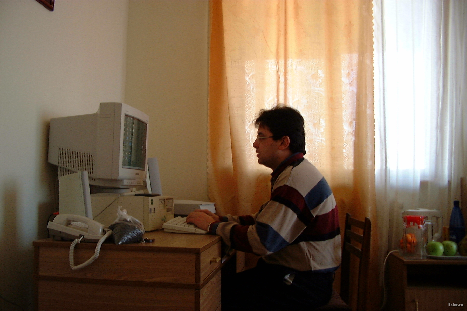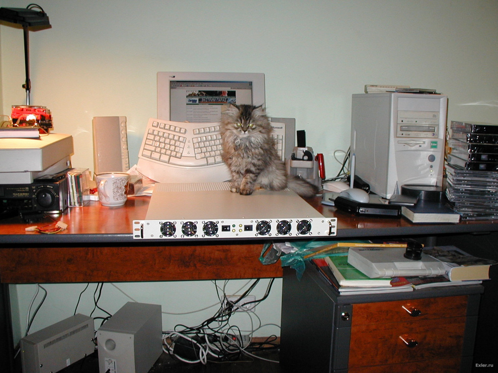 Вот так начинался сайт Exler.ru. Рабочее место. И интернетовский сервер Exler.ru, который на следующий день уехал, насколько я помню, в "Корбину". И моя тогдашняя муза - кошка Нюра.
