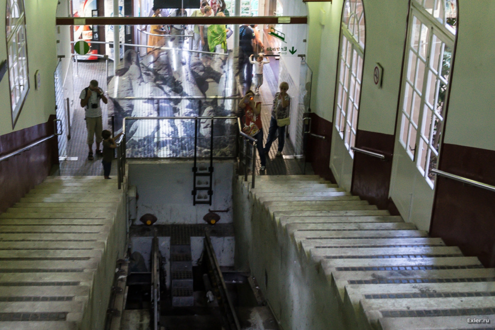 Ходят здесь два фуникулера, но рельсы проложены для одного: там на середине пути есть разъезд.