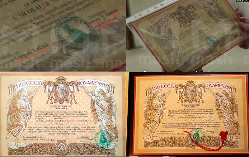 Радио Свобода выяснило, что человек, который подписал сертификат о подлинности мощей св. Николая, подаренных владельцем клуба «Мутабор» Михаилом Даниловым российскому храму в оправдание за «голую вечеринку» Анастасии Ивлеевой, с 2015 года не работает в выдавшей документ епархии итальянского города Новара – хотя на сертификате в качестве даты выдачи указано 1 августа 2018 года.