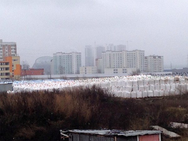 Только что снято - это улица Зенитчиков в Митино. Белые тюки, сваленные под открытым небом - это реагенты, которыми будут поливать дороги, чтобы вместо снега была черная жирная жижа.