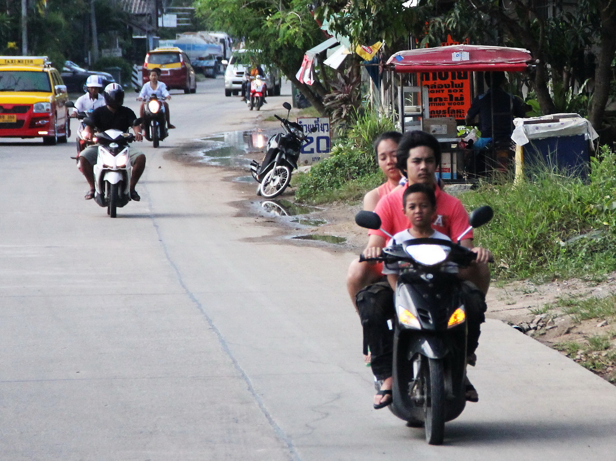 В Таиланде очень популярны мотороллеры (скутеры). Иностранные машины очень дороги из-за высоких ввозных пошлин (небольшие пошлины только на траки-грузовички, которые считаются сельскохозяйственной принадлежностью, поэтому их тут больше всего; кроме того, относительно недорого стоят иностранные машины местной сборки), так что мотороллер - самое оно: стоит недорого, бензина тратит всего ничего, везде пролезет, да и гараж для его хранения не нужен. Потому мотороллеров здесь - дикое количество: так и шныряют, так и шныряют.