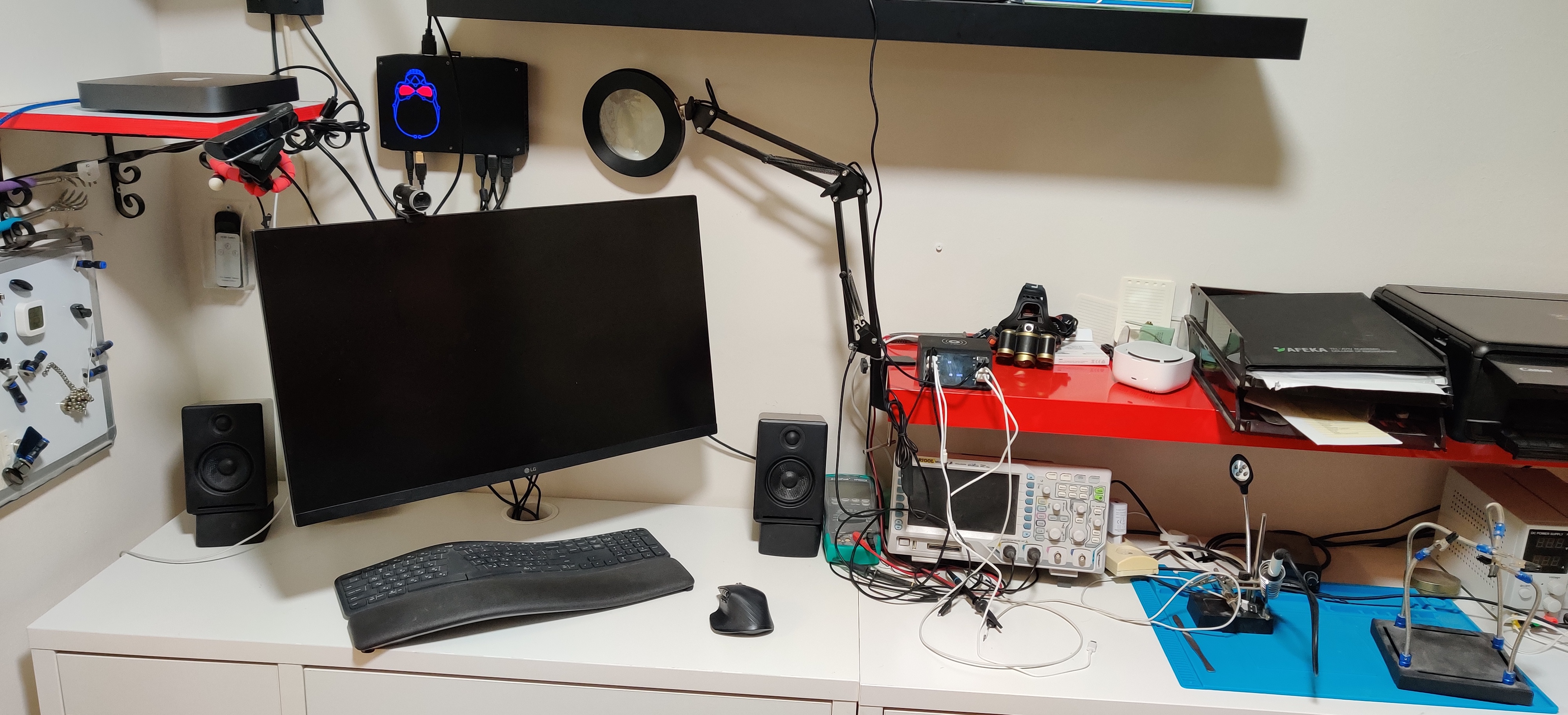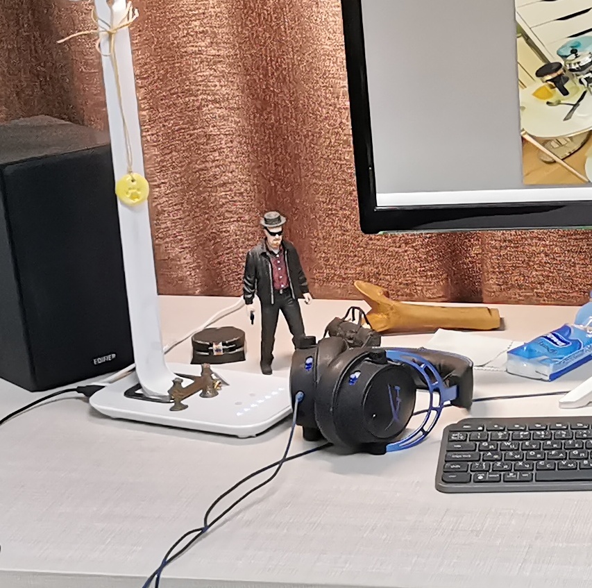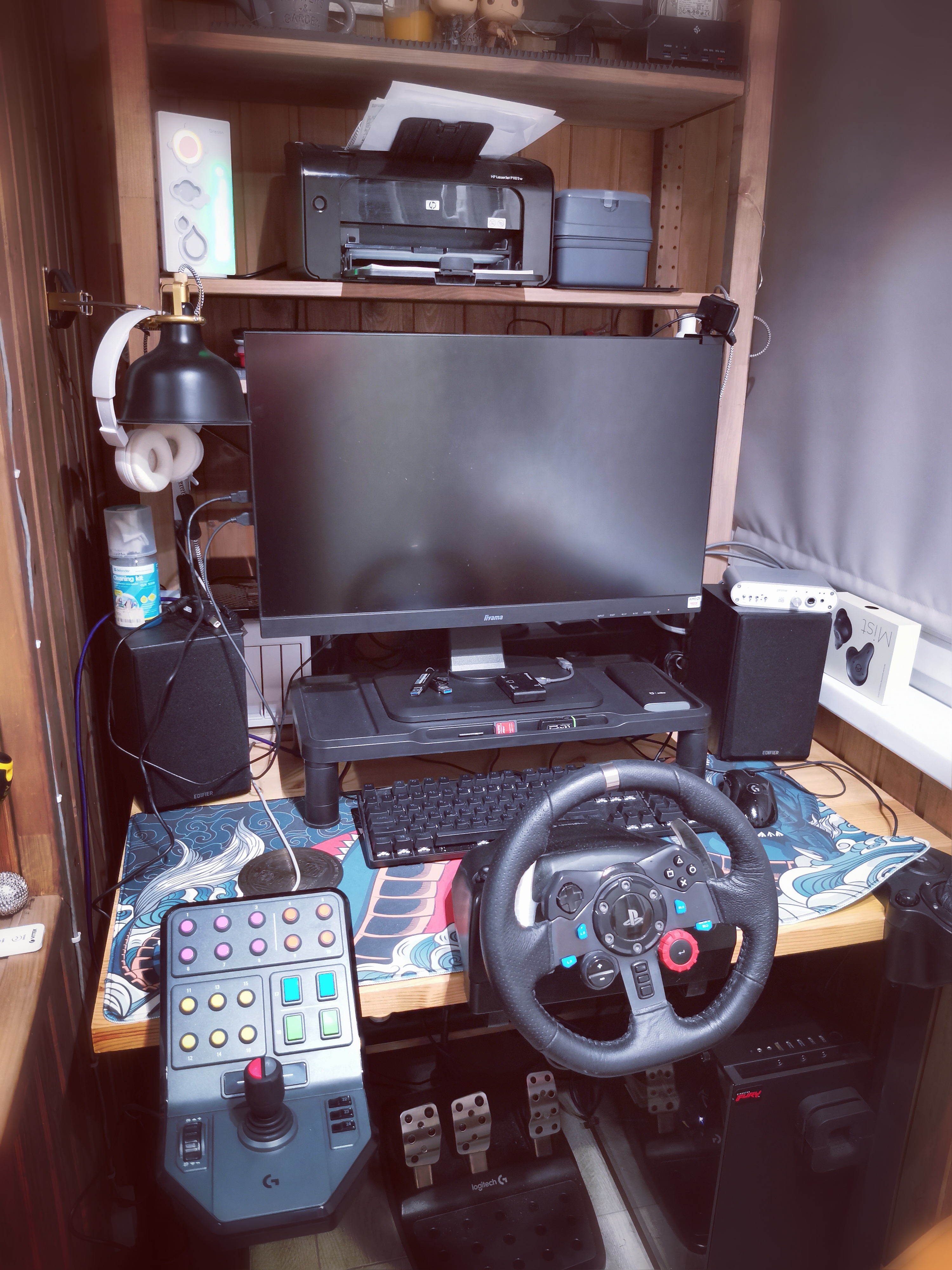 Крючок для наушников -- канцелярский зажим. Увы, все алишные поотваливались. Подствка под ноут и планшет -- Али. Свет -- филаментная лампа, типа общий, и настольный Сяоми. Клавомыши -- Логитеки.