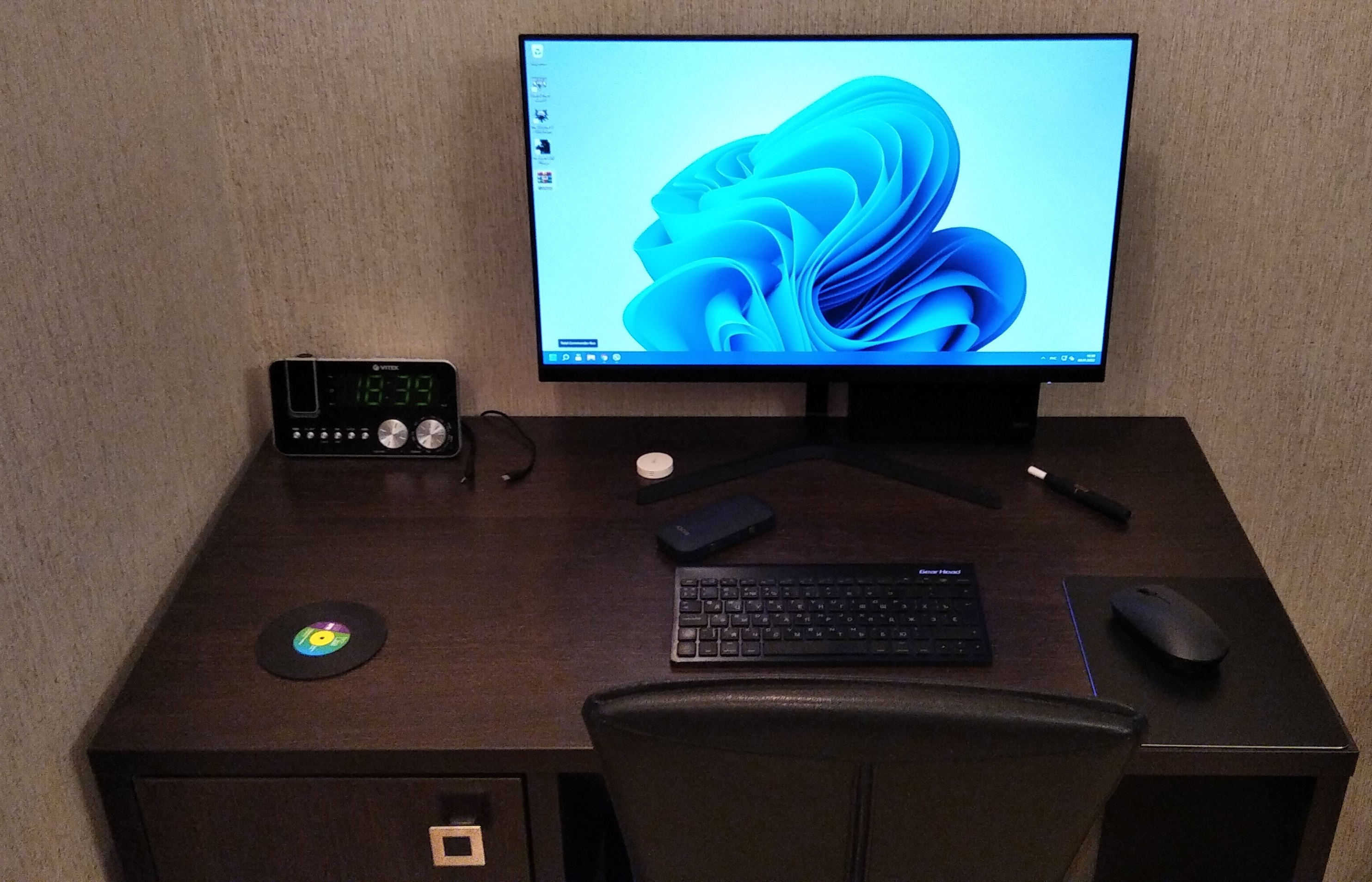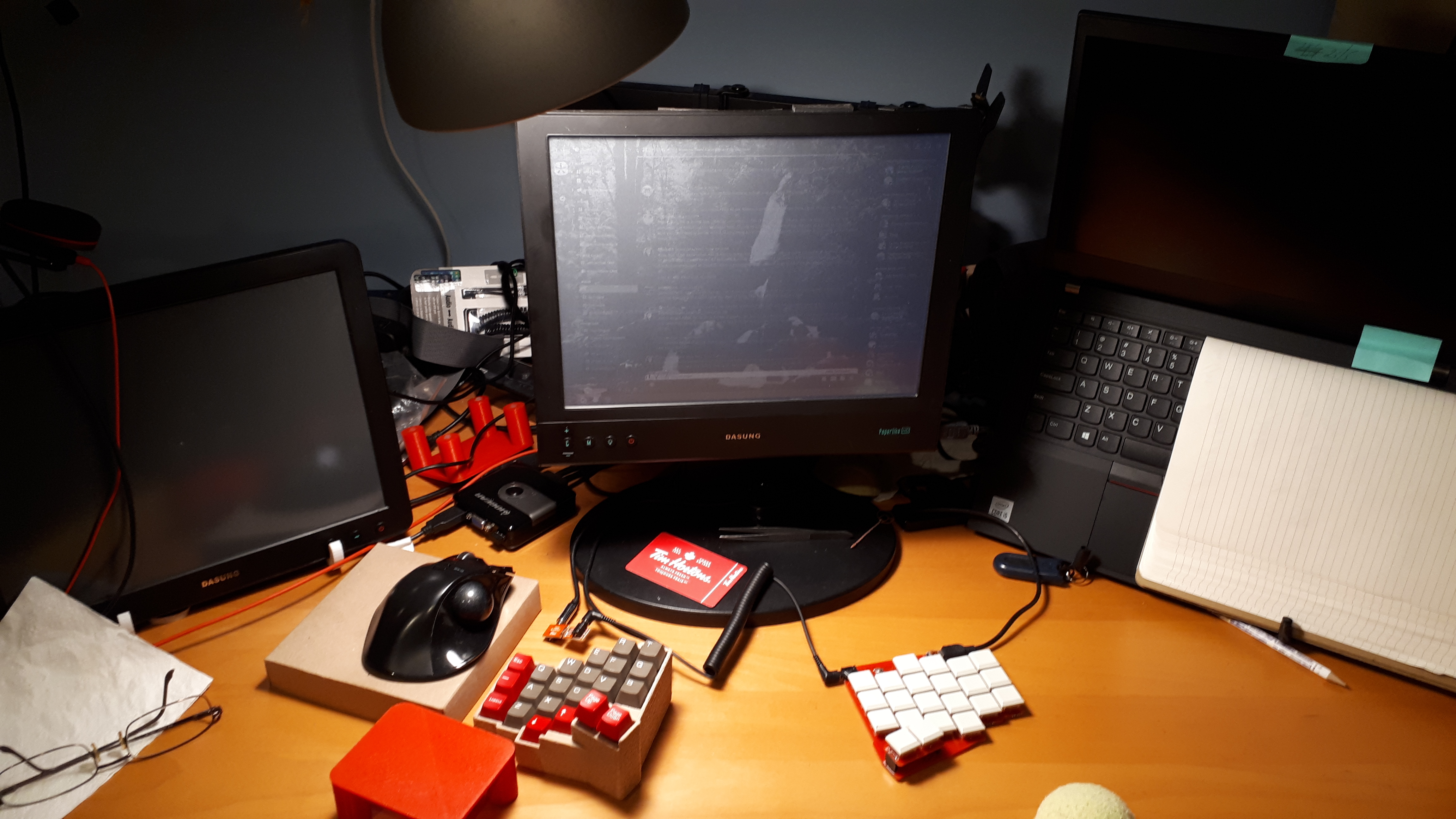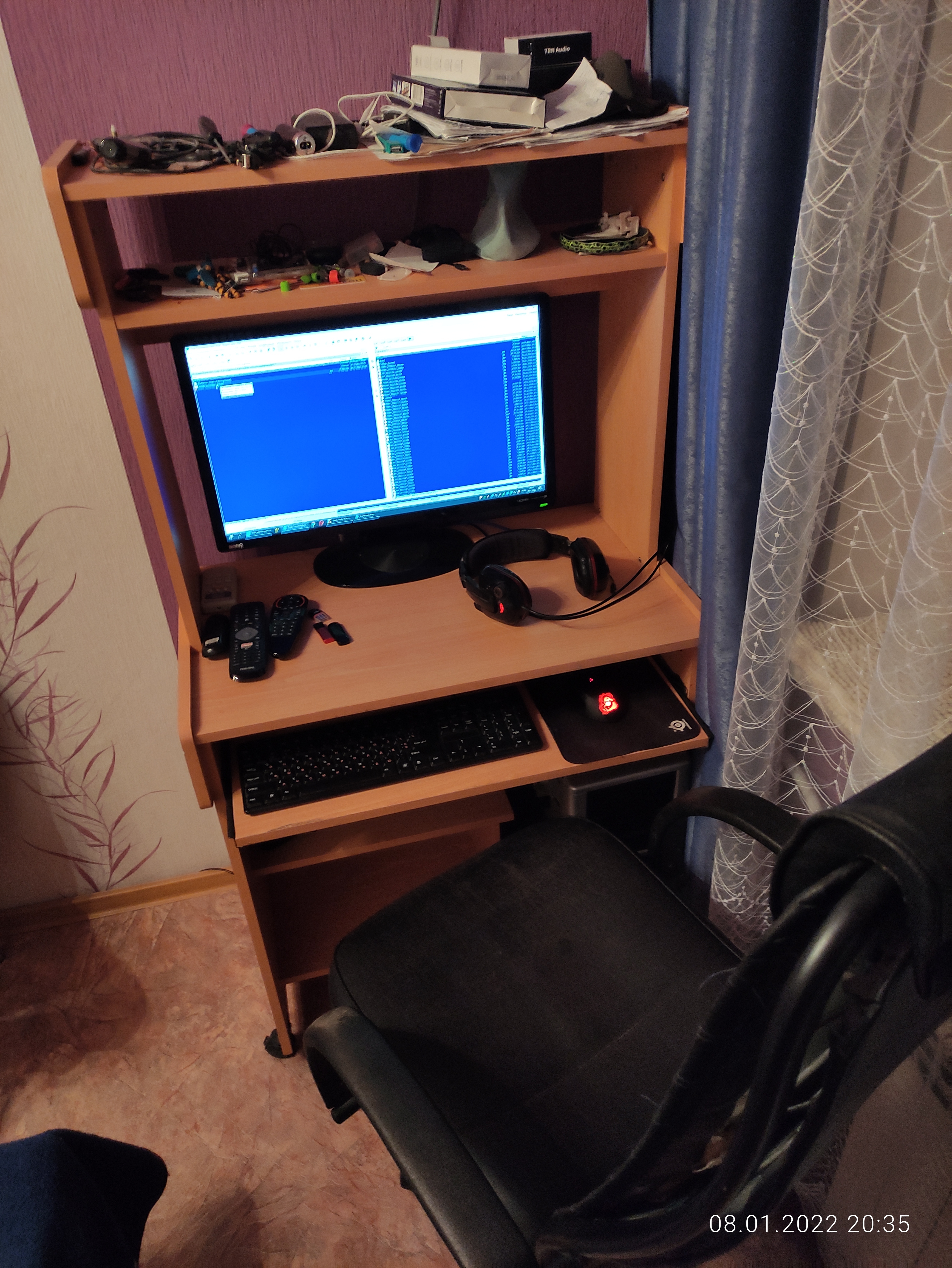 - еще на стене висит квм свич, переключающий клаву, мышь, камеру и хандсфри между ноутом и десктопом