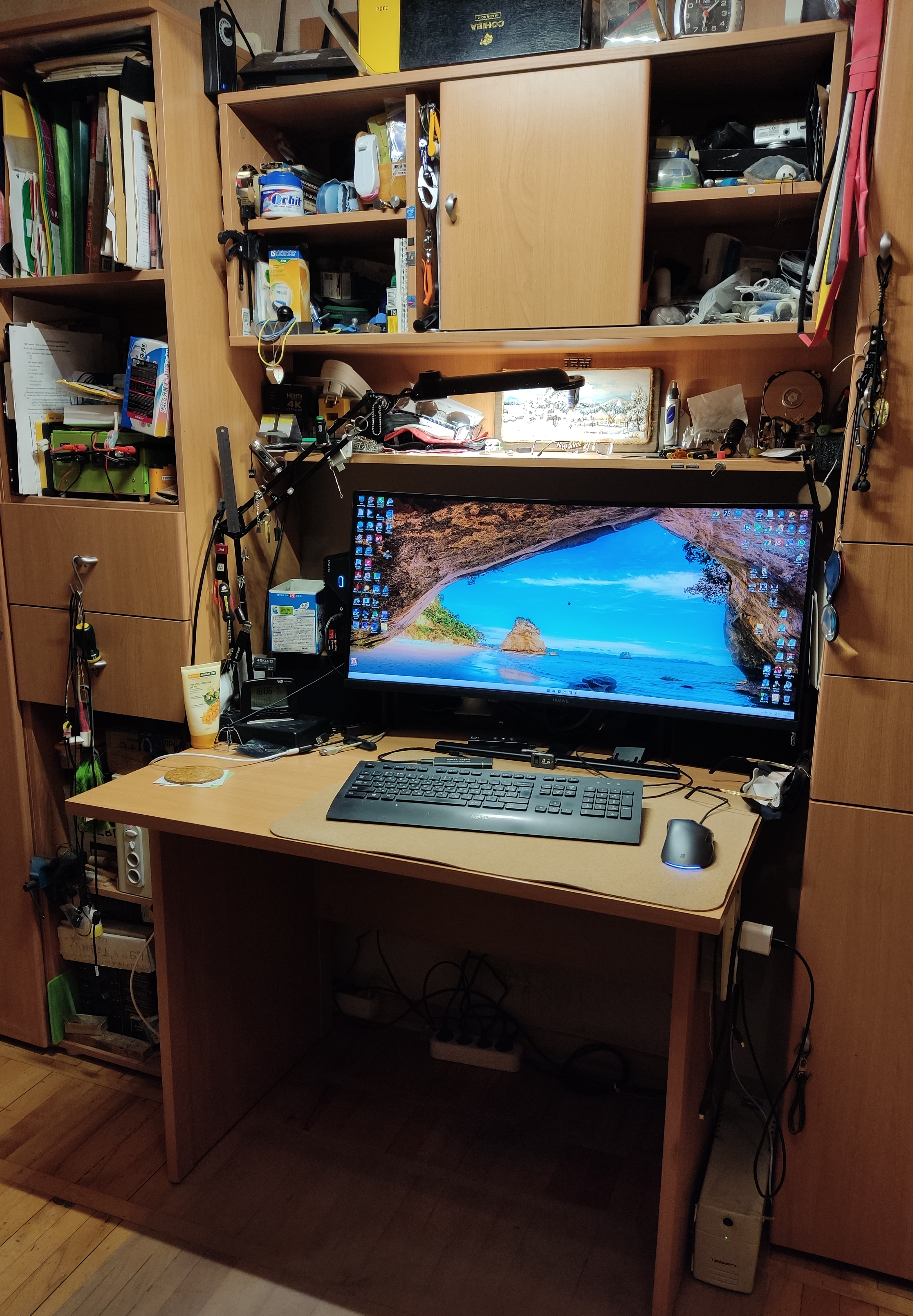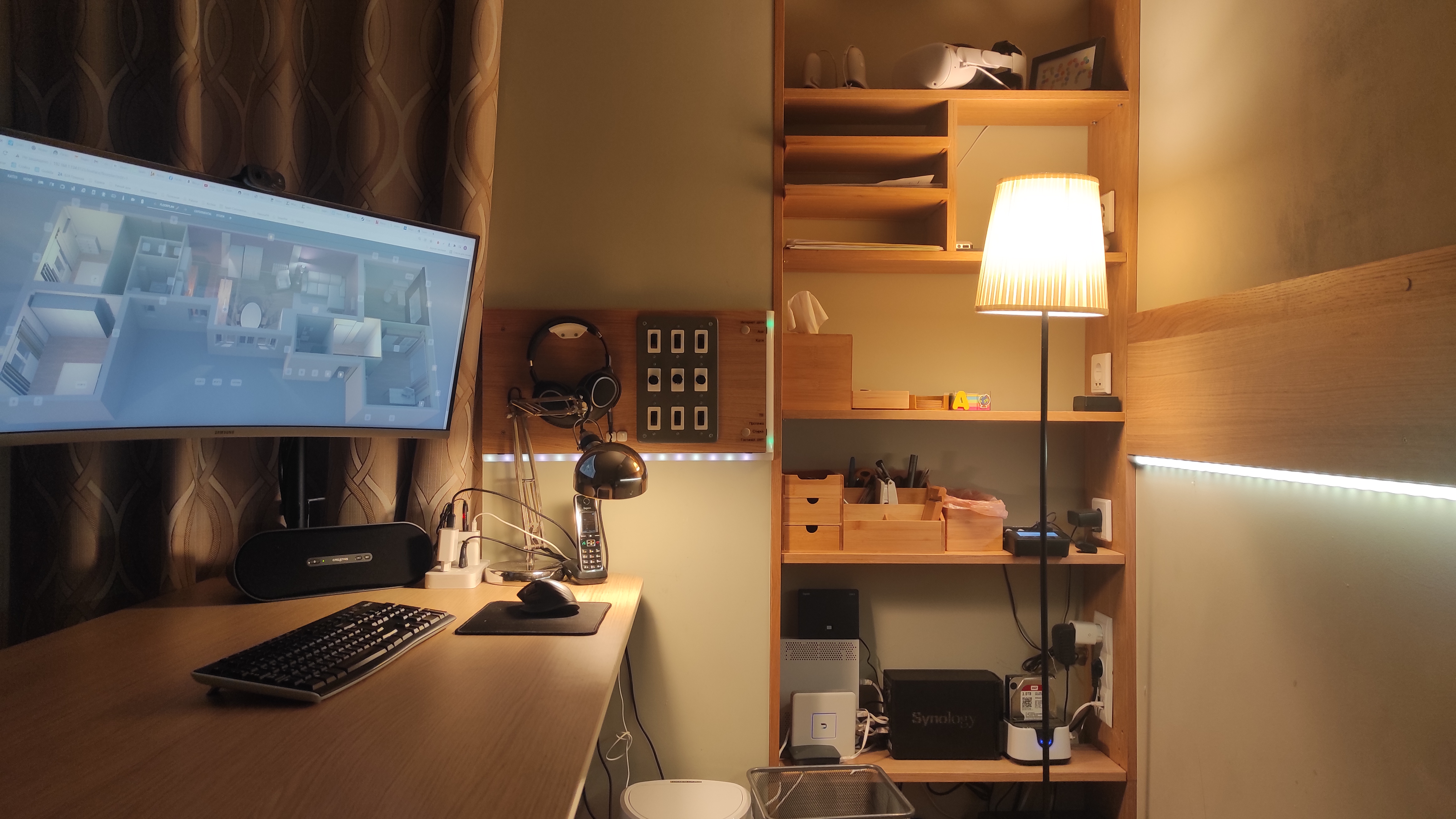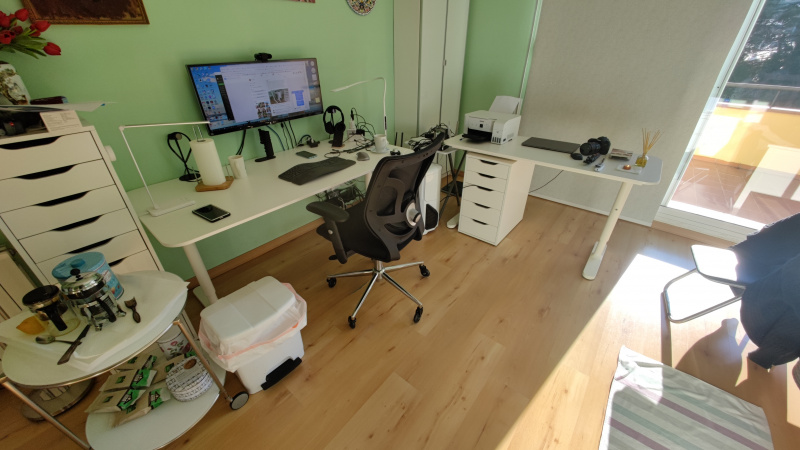 Раньше еще стояли колонки и снизу басил сабвуфер, однако вчера я вдруг понял, что включаю эти колонки даже и не каждые полгода, после чего убрал их (динамиков монитора вполне хватает, а кино я смотрю в наушниках). Две настольных лампы - я очень не люблю включать в кабинете верхний свет, а одной лампы недостаточно. Также еще слева от большой тумбочки стоит напольный светильник, который включается со смартфона через умную розетку.