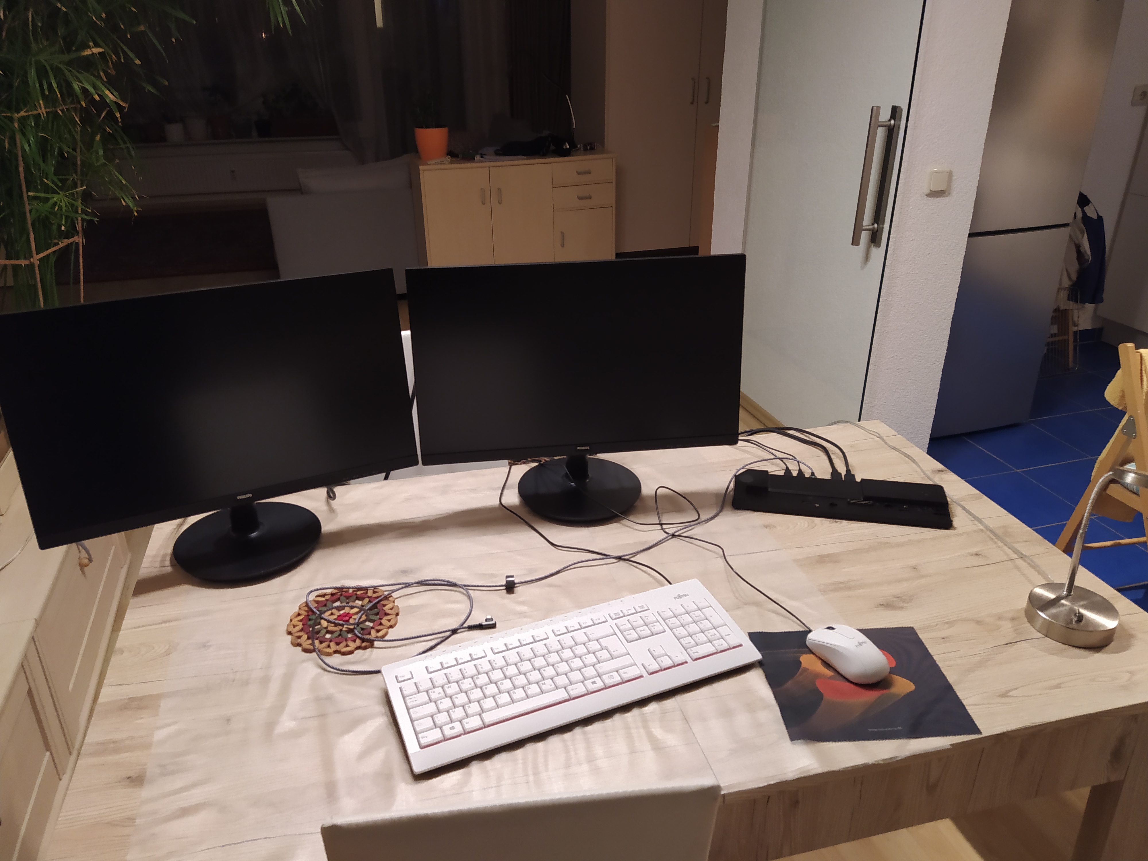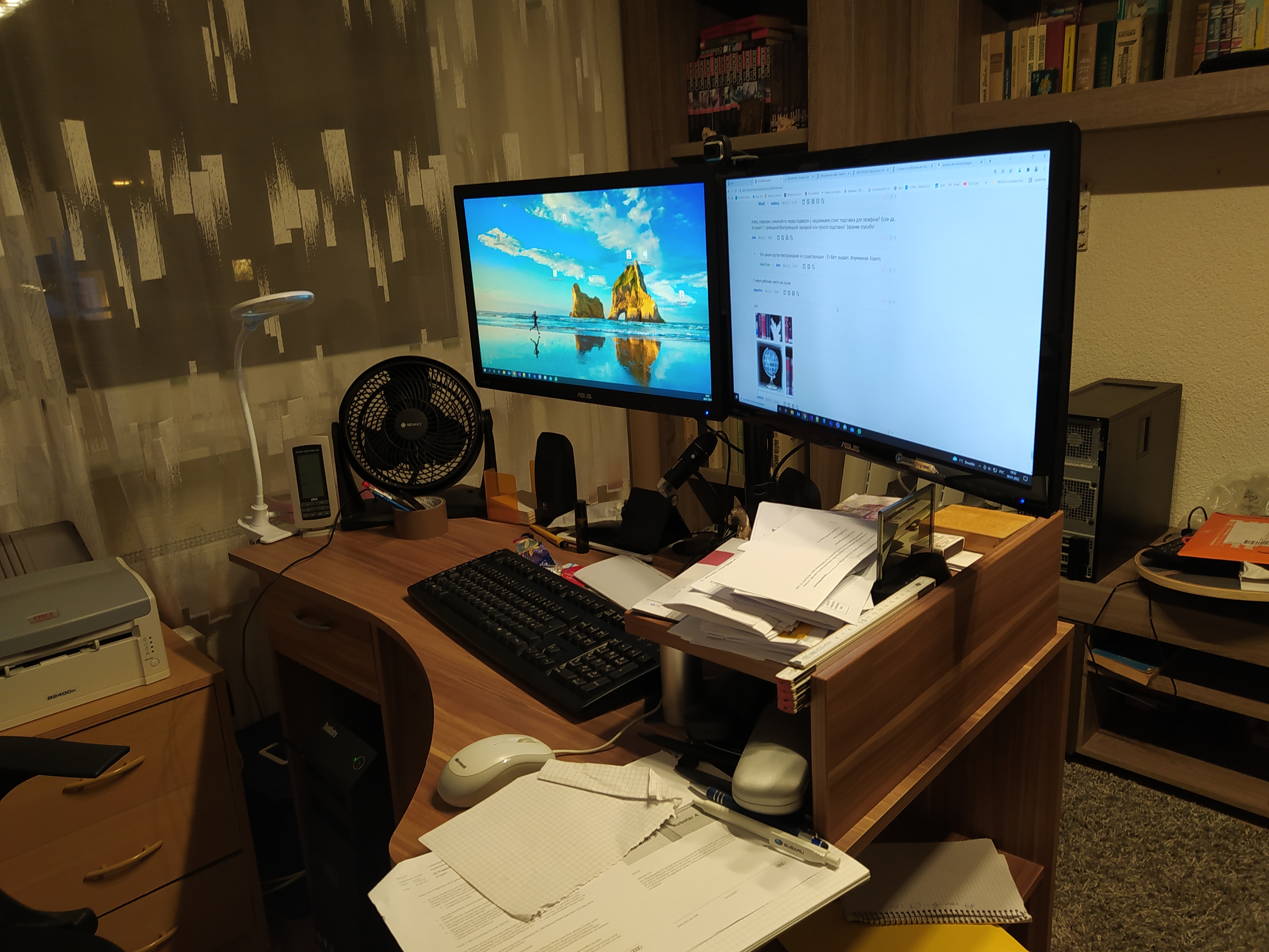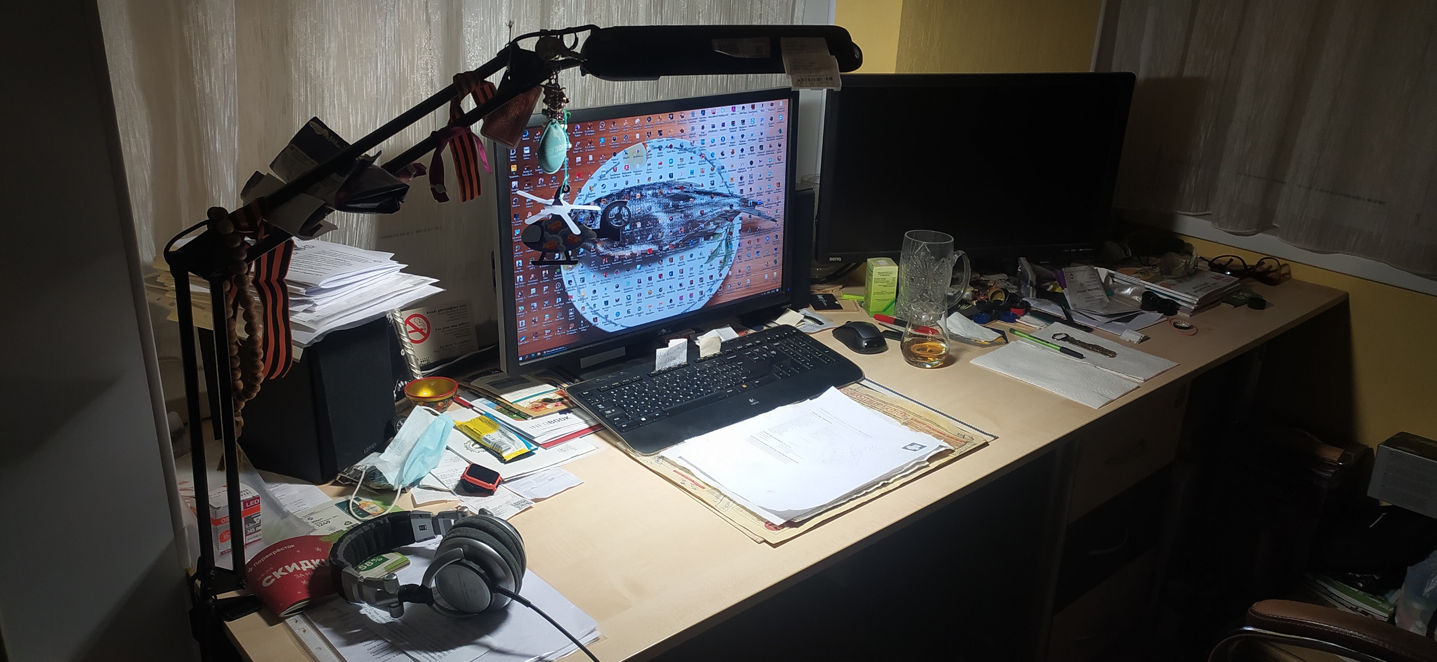 Раньше еще стояли колонки и снизу басил сабвуфер, однако вчера я вдруг понял, что включаю эти колонки даже и не каждые полгода, после чего убрал их (динамиков монитора вполне хватает, а кино я смотрю в наушниках). Две настольных лампы - я очень не люблю включать в кабинете верхний свет, а одной лампы недостаточно. Также еще слева от большой тумбочки стоит напольный светильник, который включается со смартфона через умную розетку.