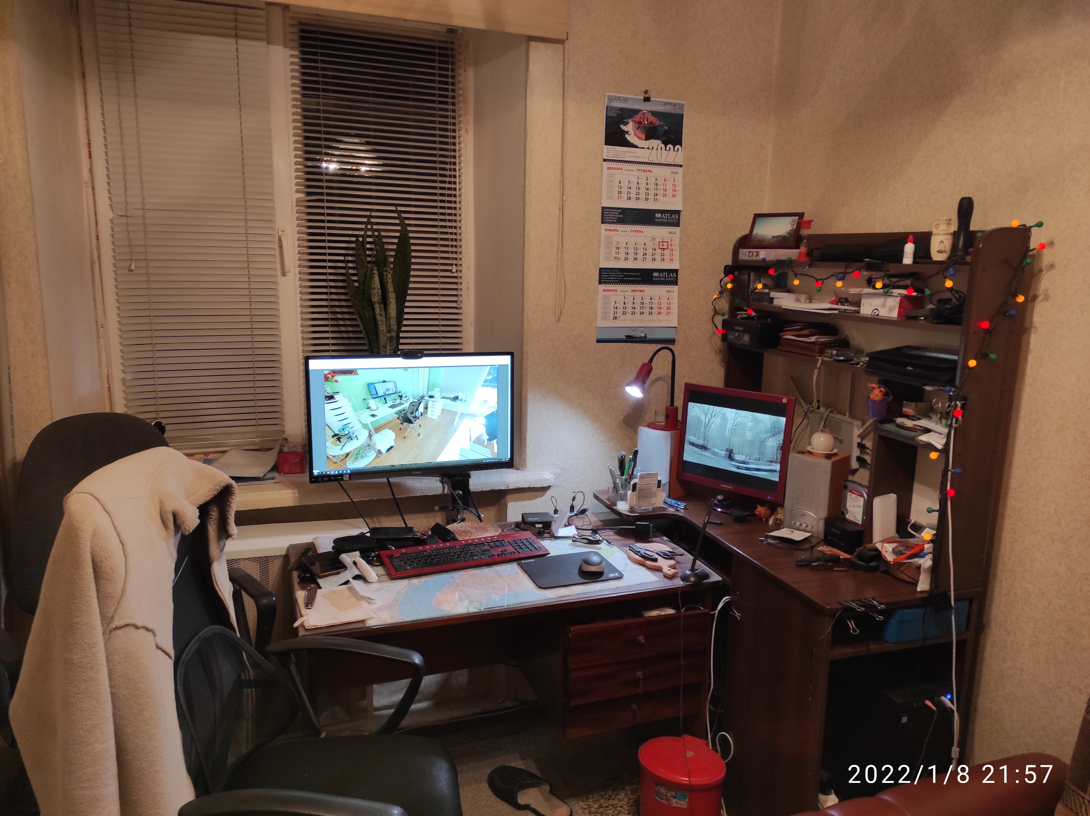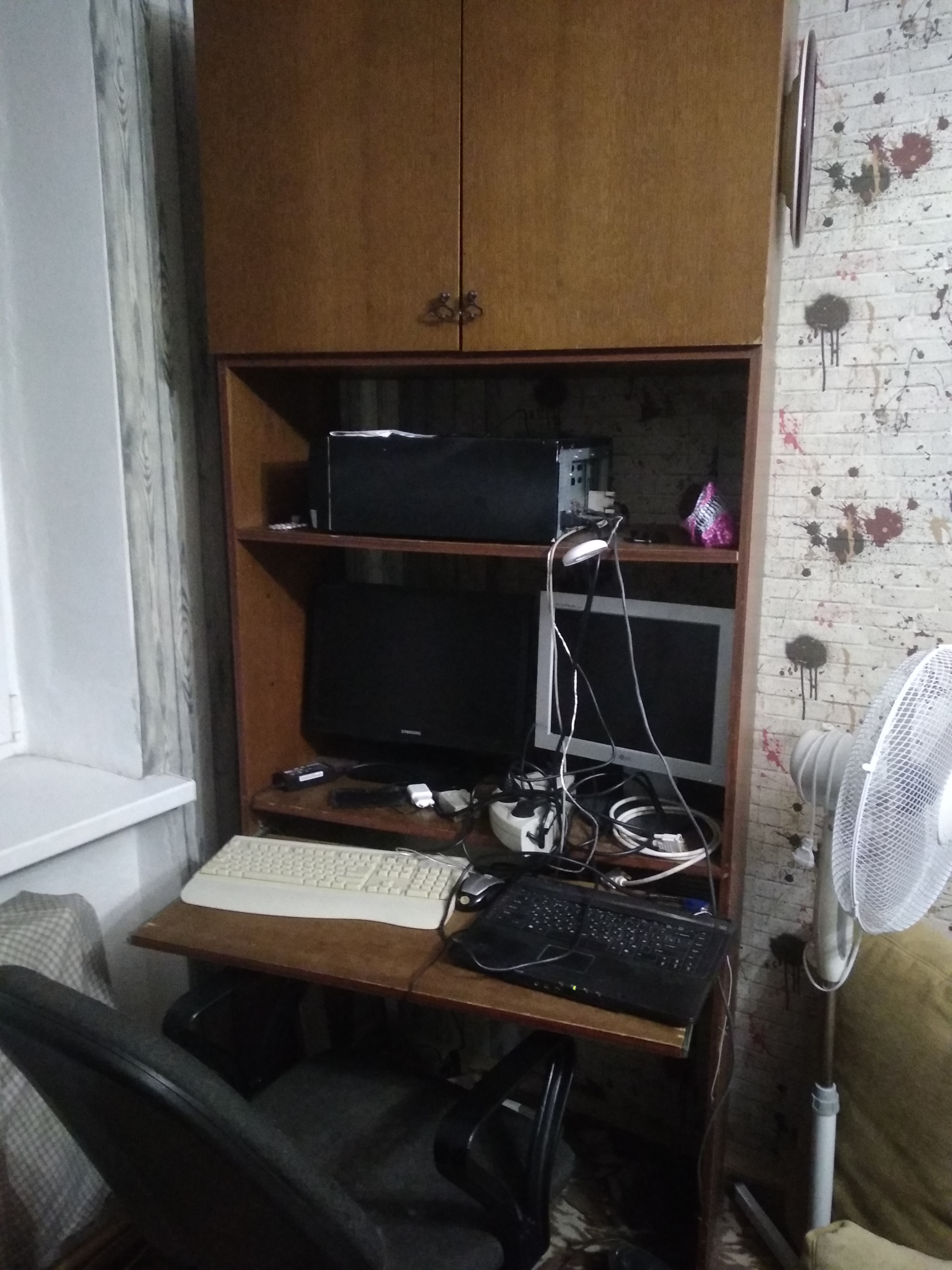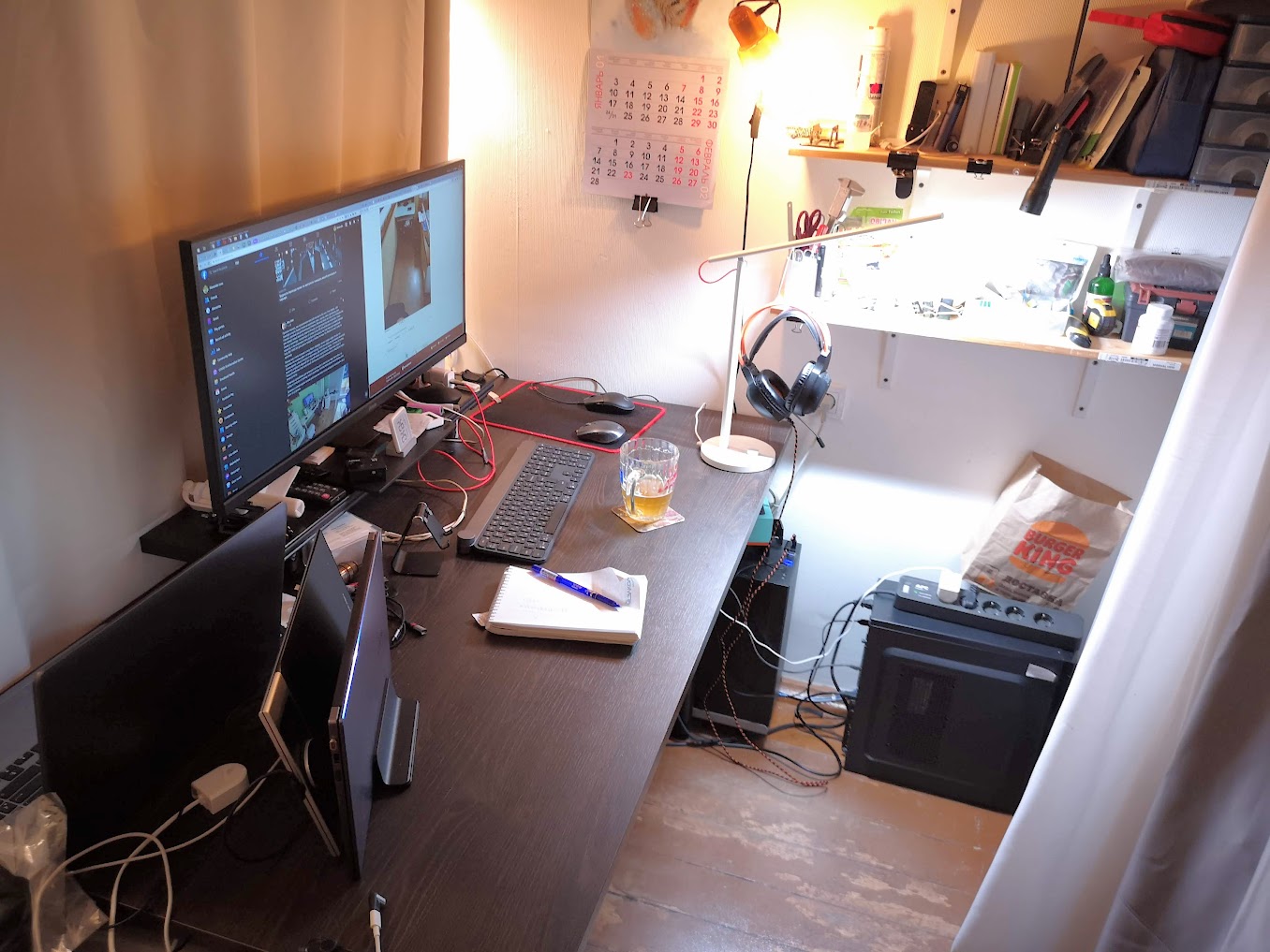 - каждый из двух мониторов двойного назначения - подключены к рабочему ноуту (слева на столе) и домашнему писюку (висит на стене)
