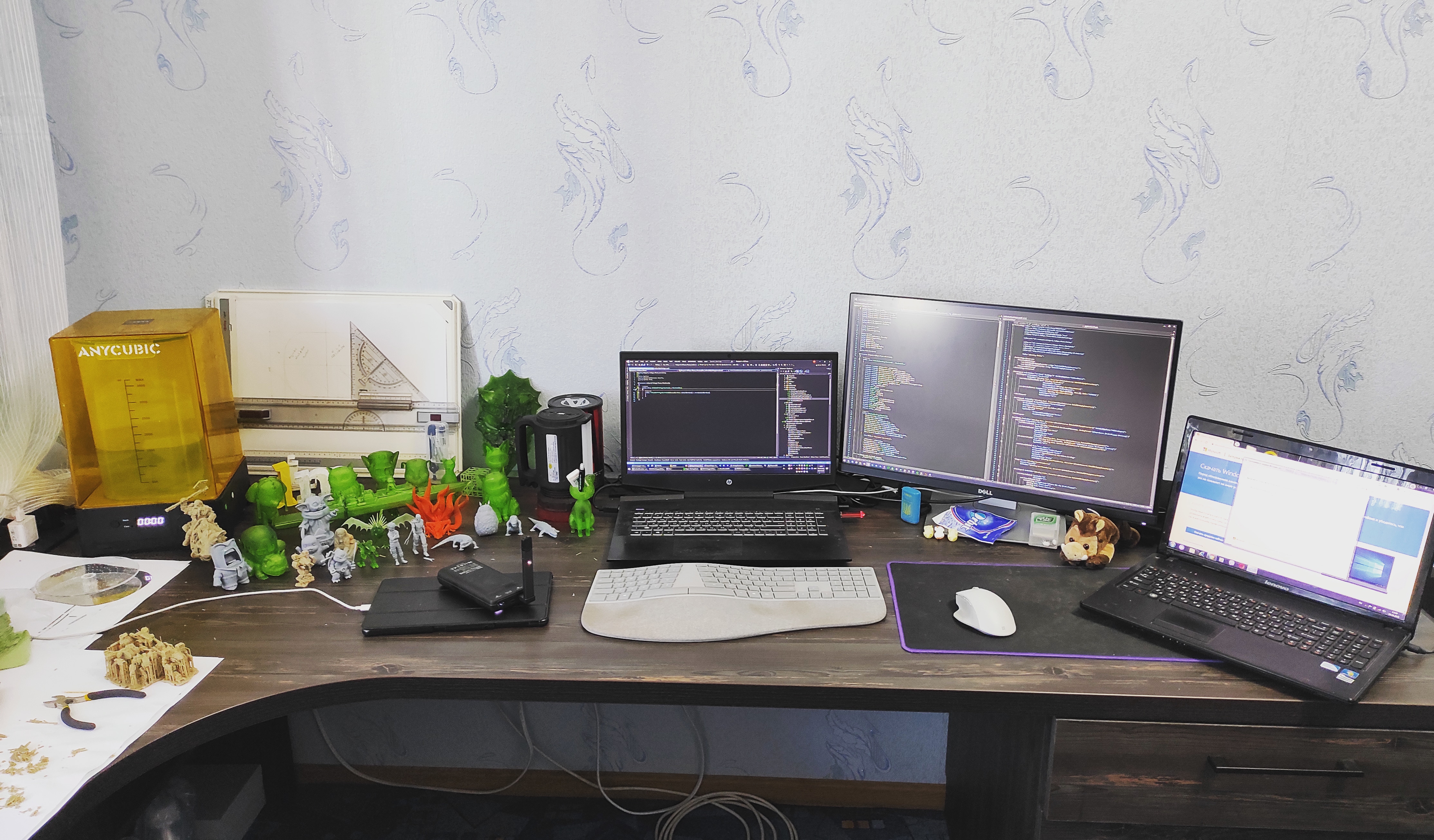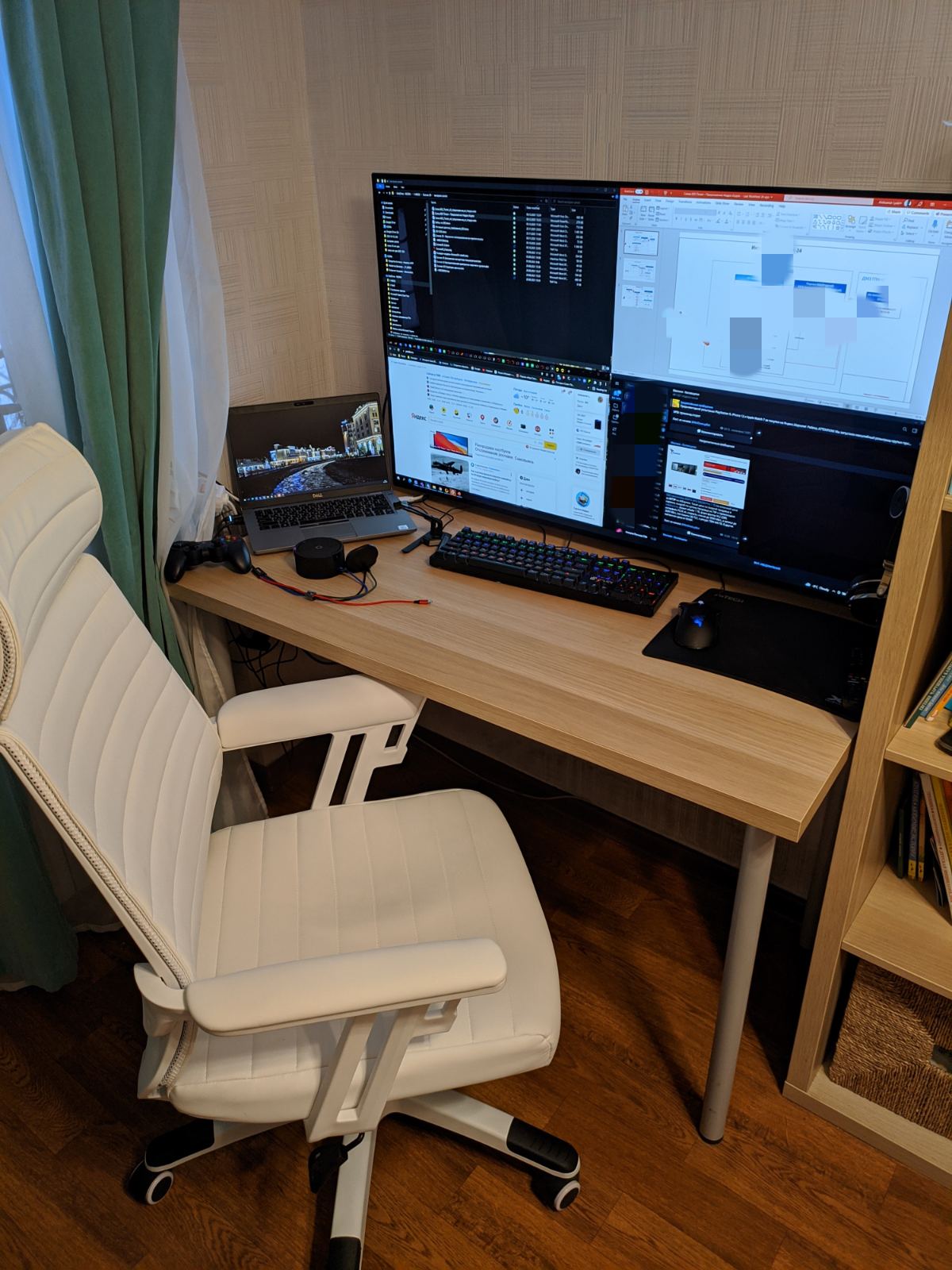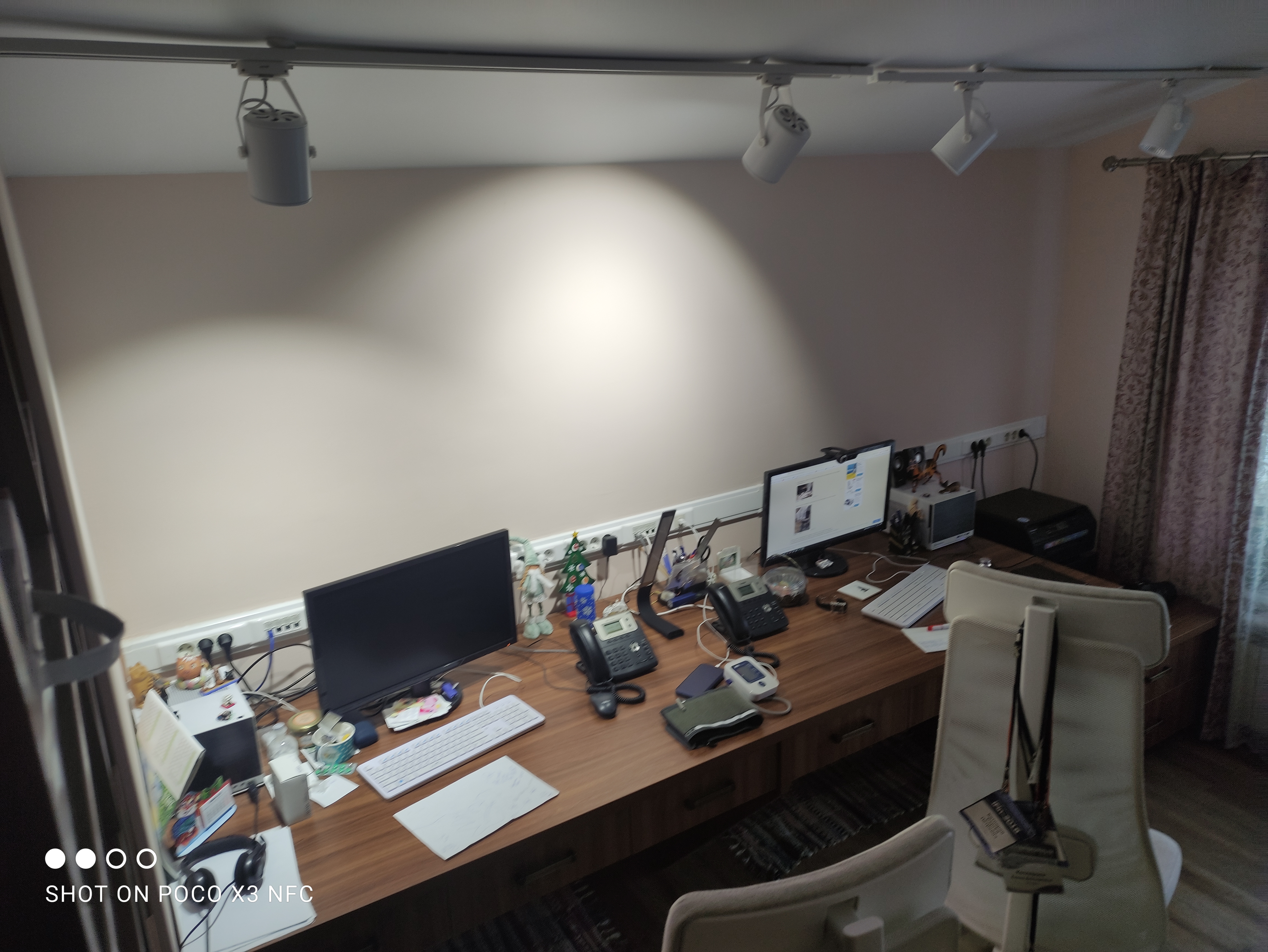 - каждый из двух мониторов двойного назначения - подключены к рабочему ноуту (слева на столе) и домашнему писюку (висит на стене)