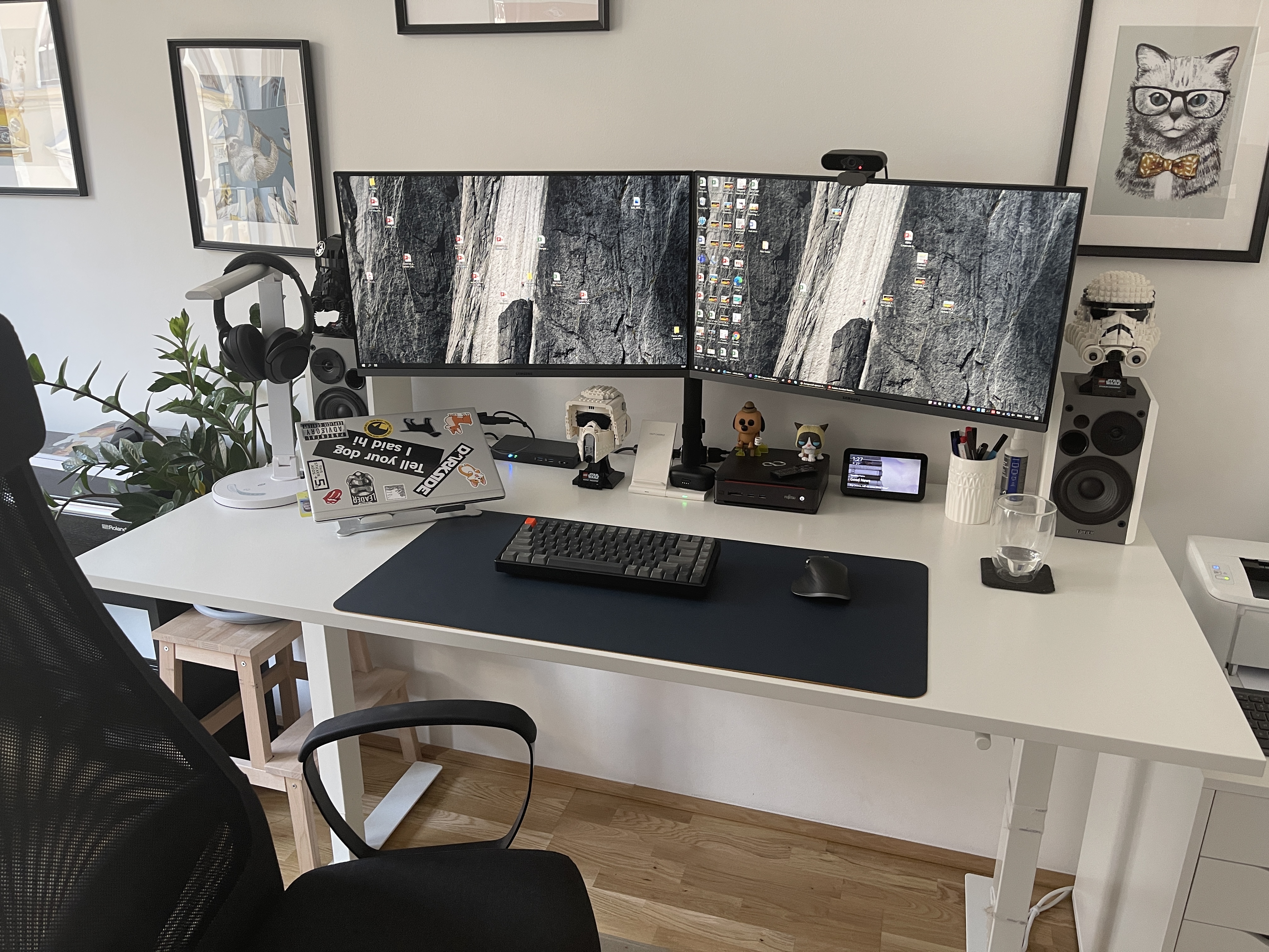 Мониторы 2х27, кронштейн с Амазона, стол икея с механической регулировкой по высоте, стул икея, клавиатура Keychron K2, мышь логитек мх3, ноутбук рабочий HP. Колонки Edifier, но тоже надо убрать - не слушаю музыку сидя за рабочим столом.