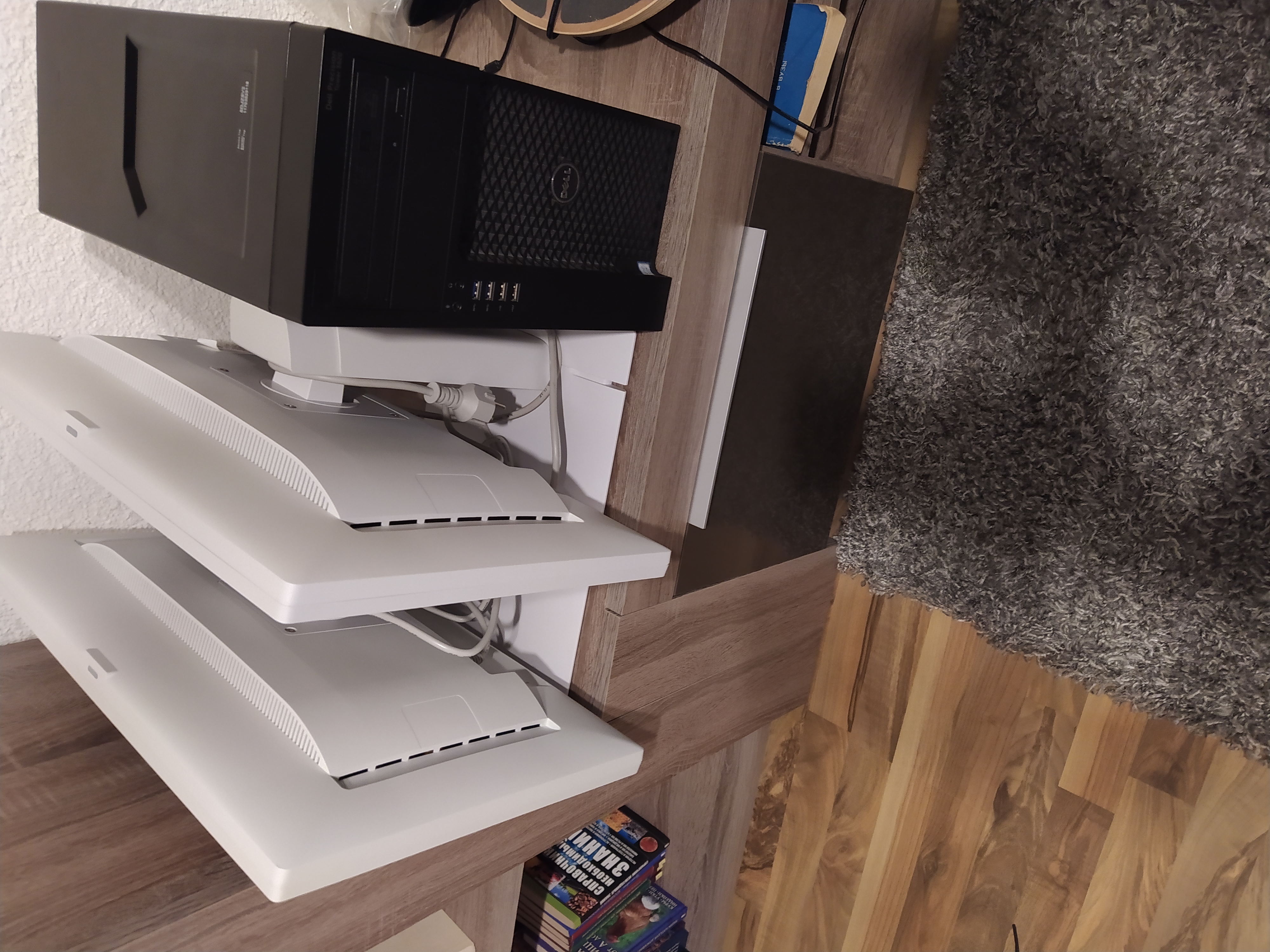 Оба монитора на кронштейнах прикрученых к стене, можно легко двигать. Но пришлось дырку в столешнище сверлить чтоб провода под стол пустить.