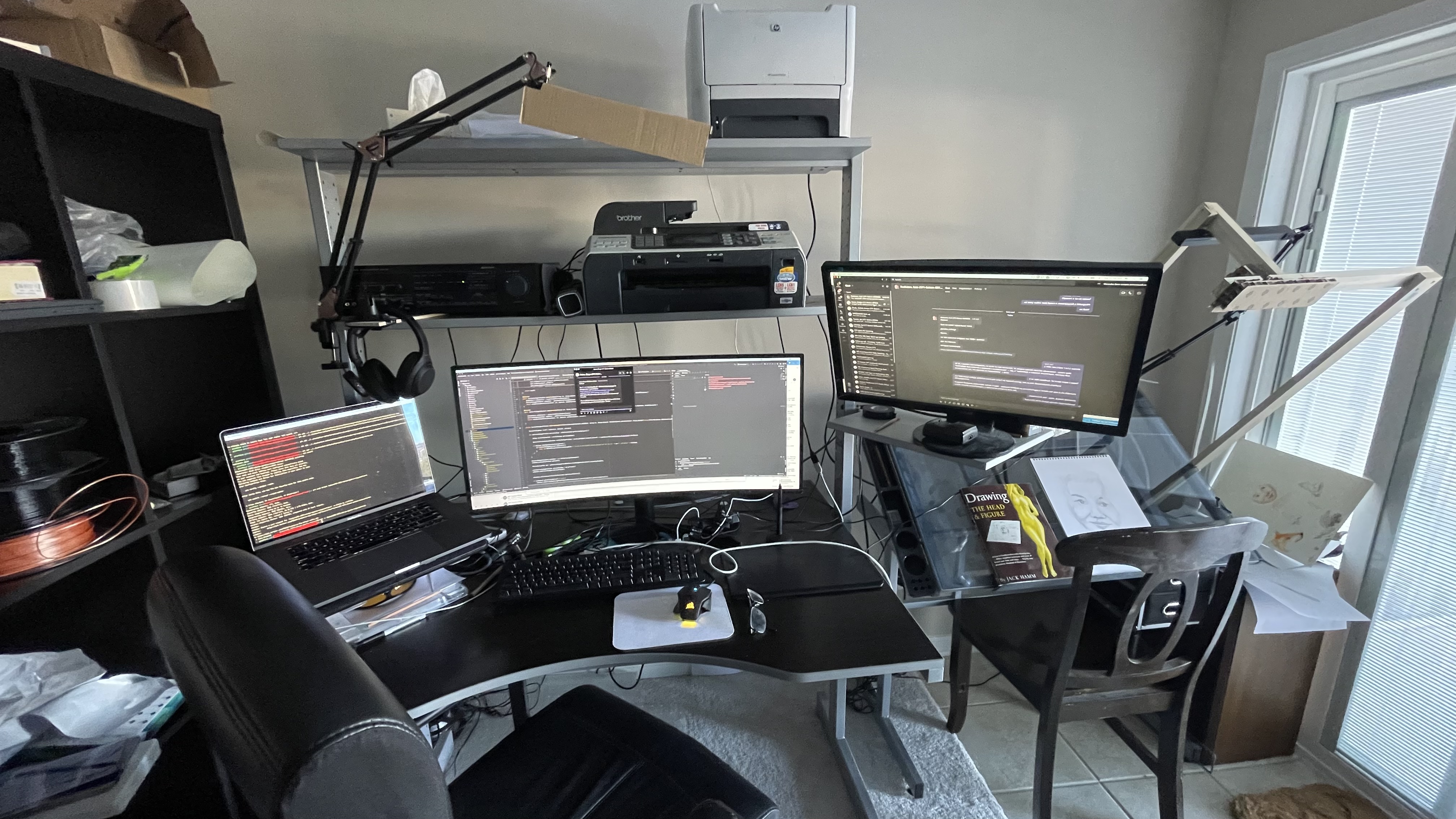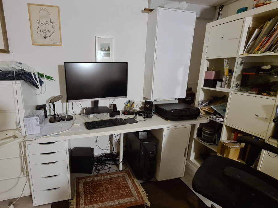 Просили показать, как организовано мое рабочее место. Вот оно. Стол справа - для принтера и ноута. Перед столом на маленьком столе - роутер, свитч, удлинитель, док-станция с дисками для дополнительных бэкапов. Монитор висит на стене, но в понедельник уже приедет новый монитор, заметно больше, а то пространства уже не хватает. Слева-справа от монитора - трекеры от шлема Oculus Rift (Юный Каталан со шлемом изредка играется), и эти трекеры очень удобно использовать как подставки для наушников - Sony WH-1000X M3 (для дома и поездок) и Creative Aurvana Trio Wireless (в них я хожу на прогулки).