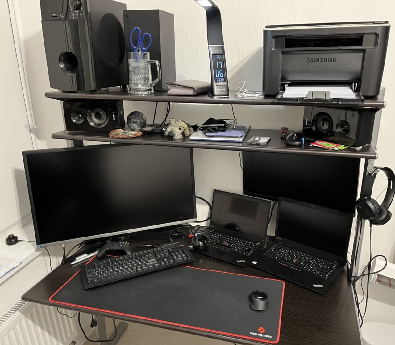 Два ноута, клава Das Keyboard, обожаю механику. Недорогой 4к 32 дюйма монитор. Древний МФУ, мне хватает более чем. Последний xbox, раз в неделю.