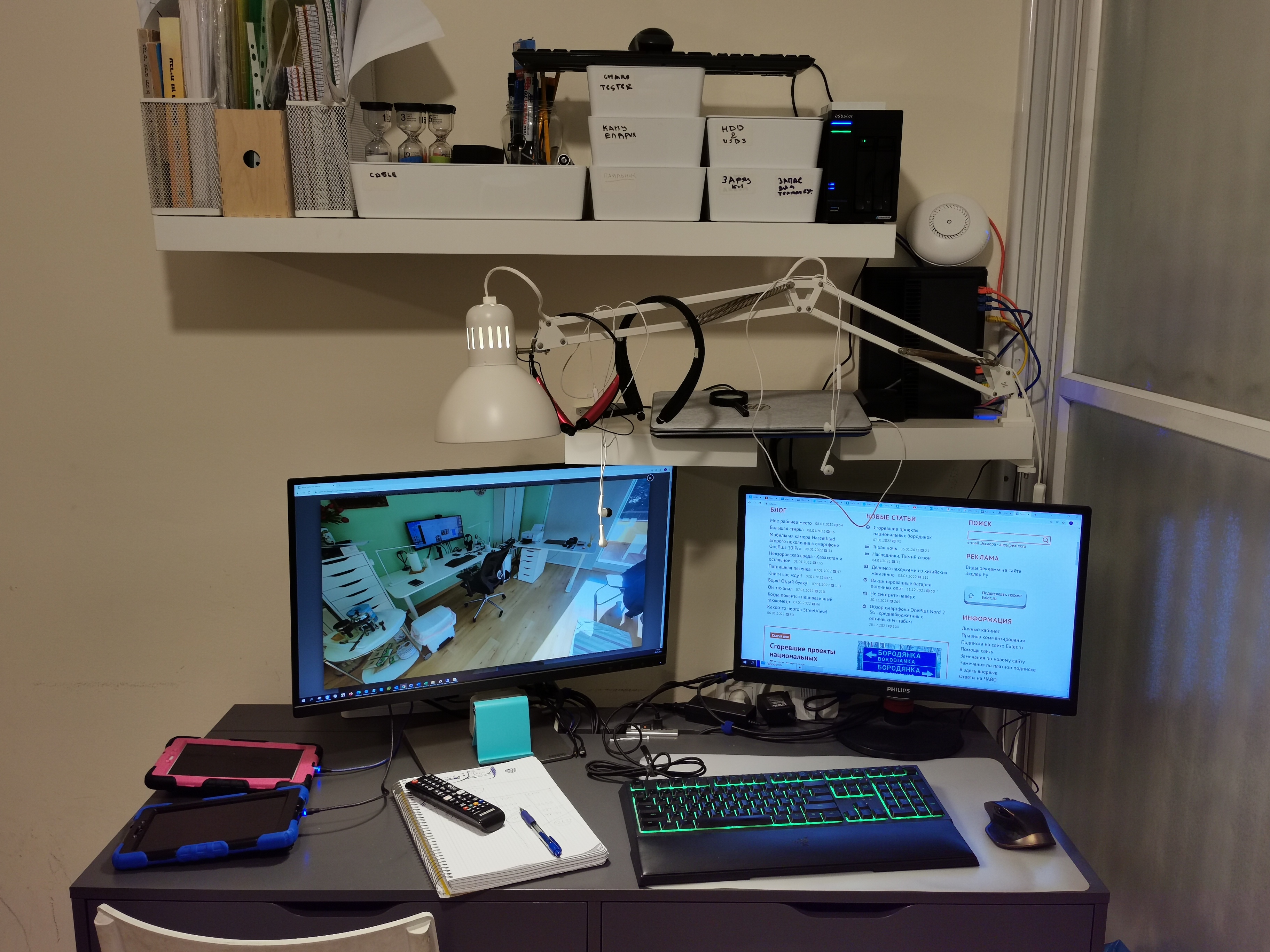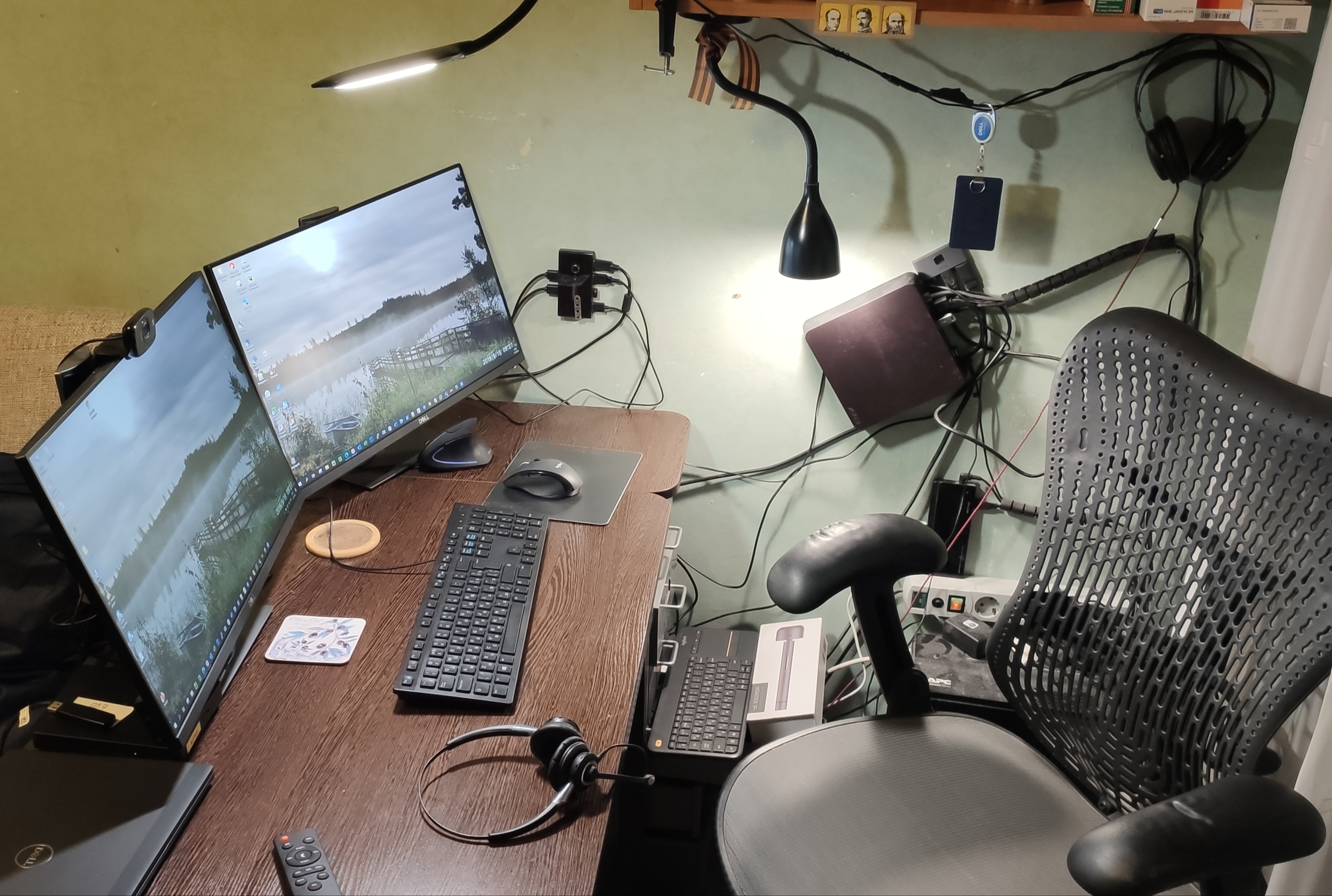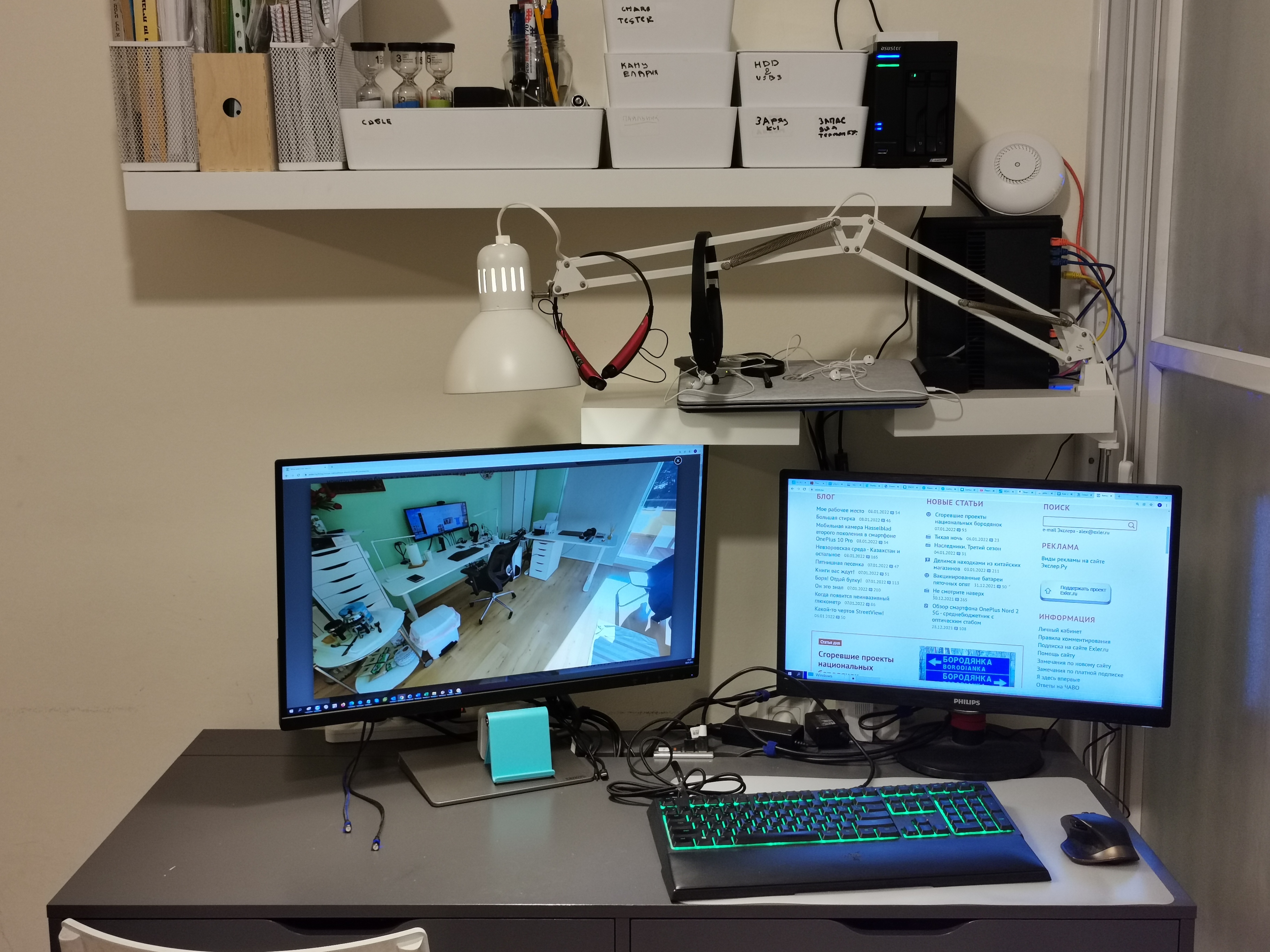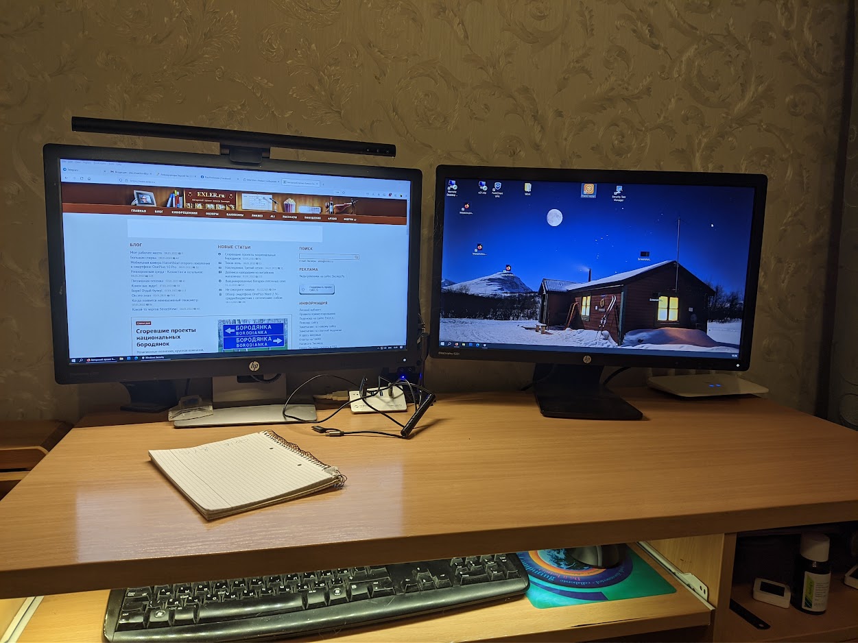 Над левым монитором стоит лампа от Baseus. Над клавиатурой к столу приклеена led лента, запитанная от USB