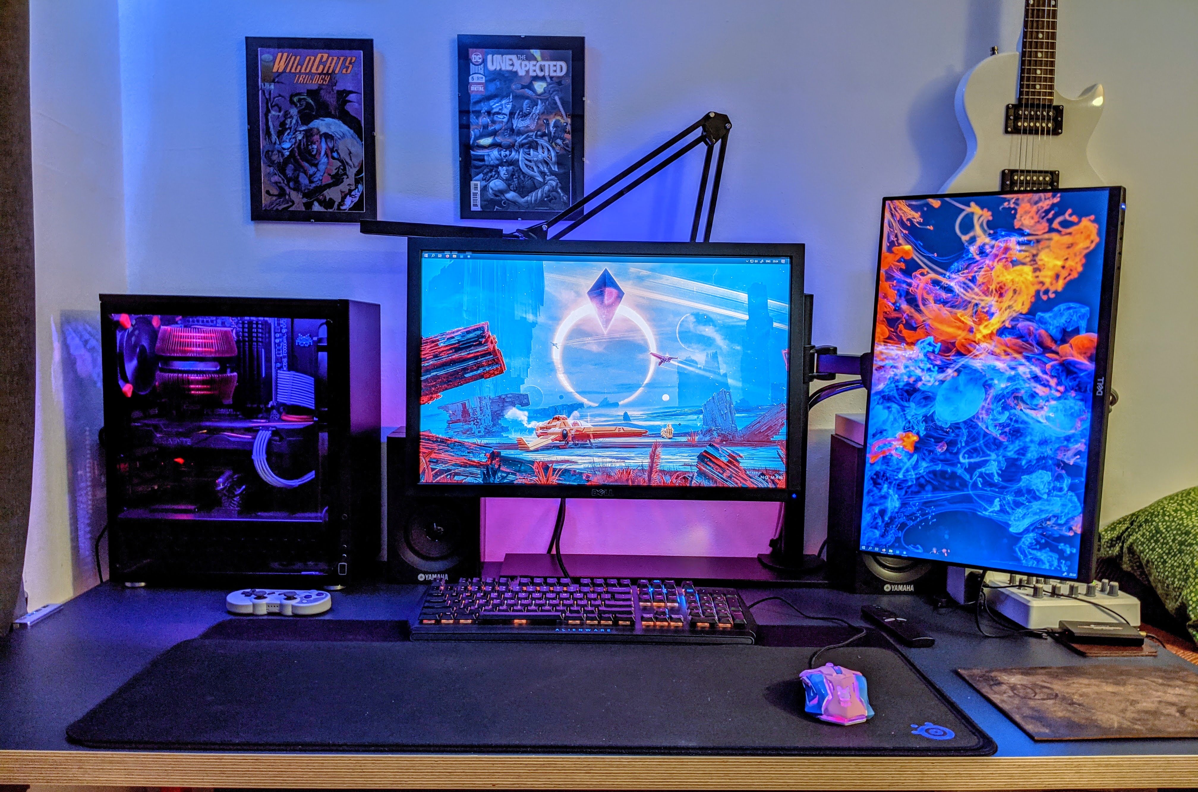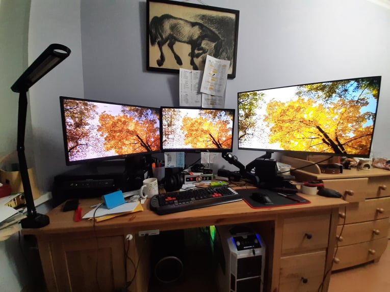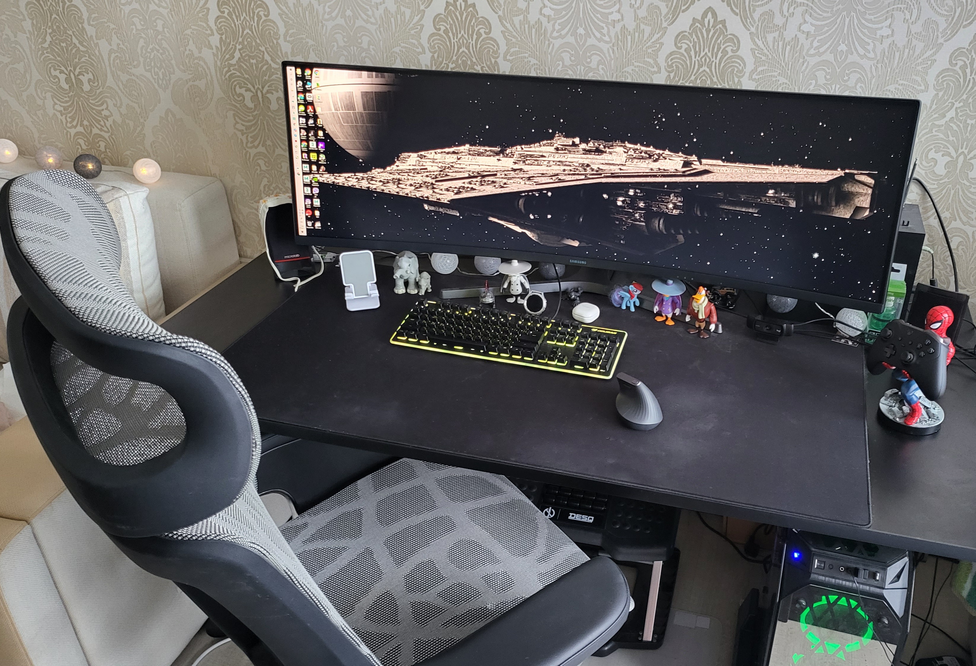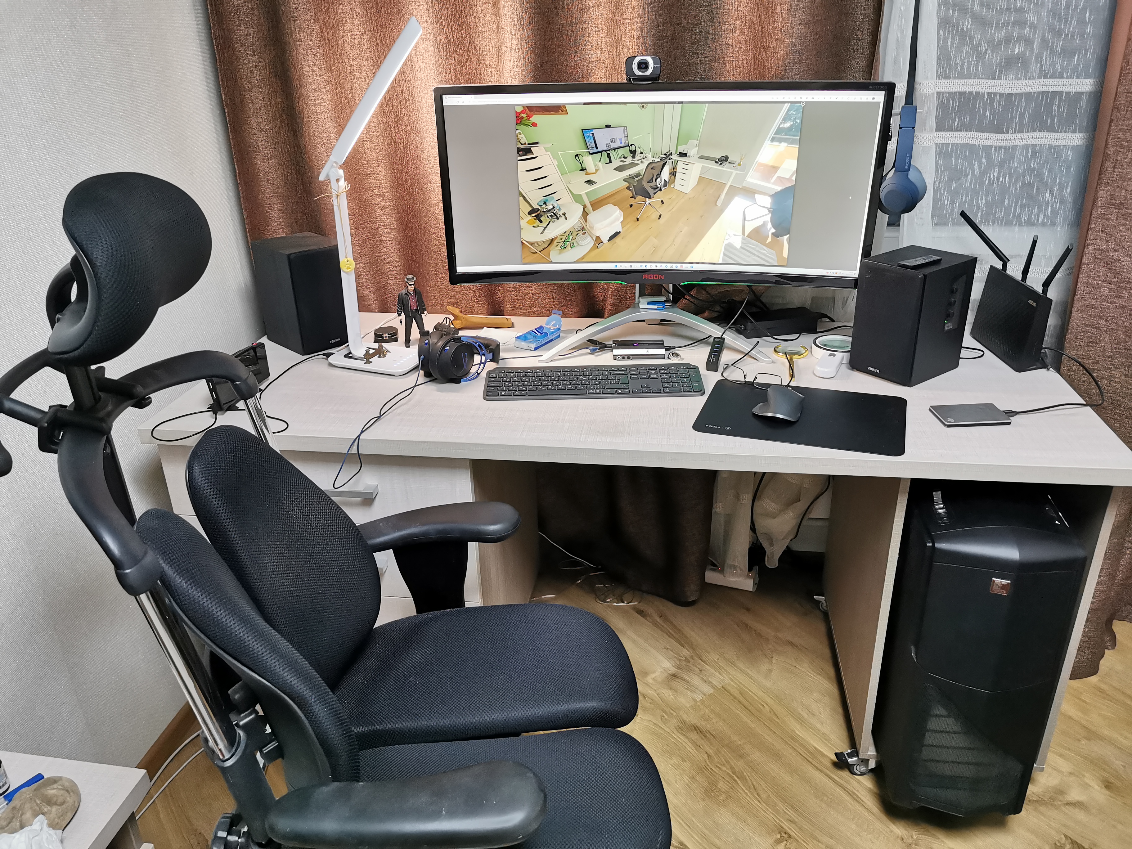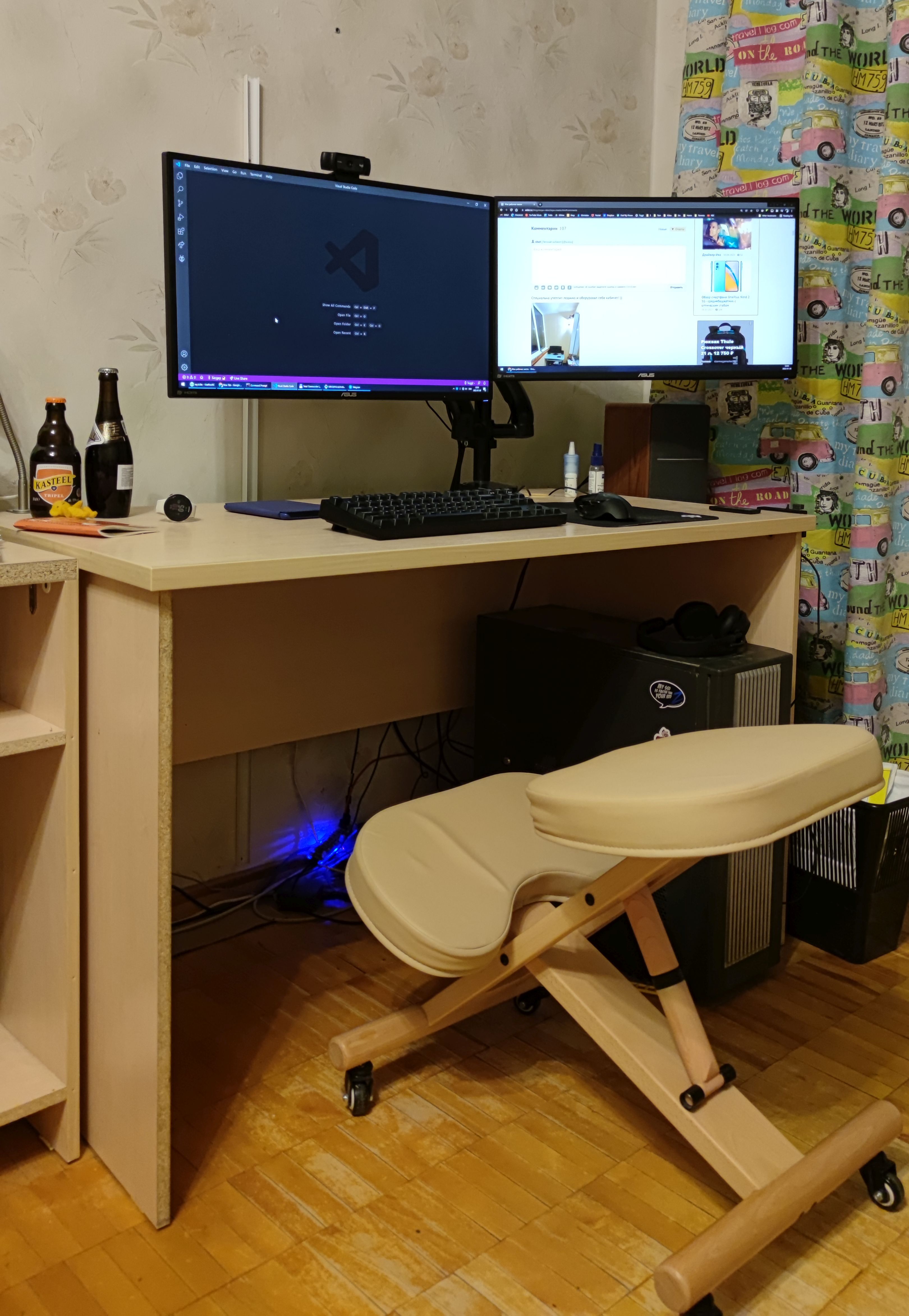 Над левым монитором стоит лампа от Baseus. Над клавиатурой к столу приклеена led лента, запитанная от USB