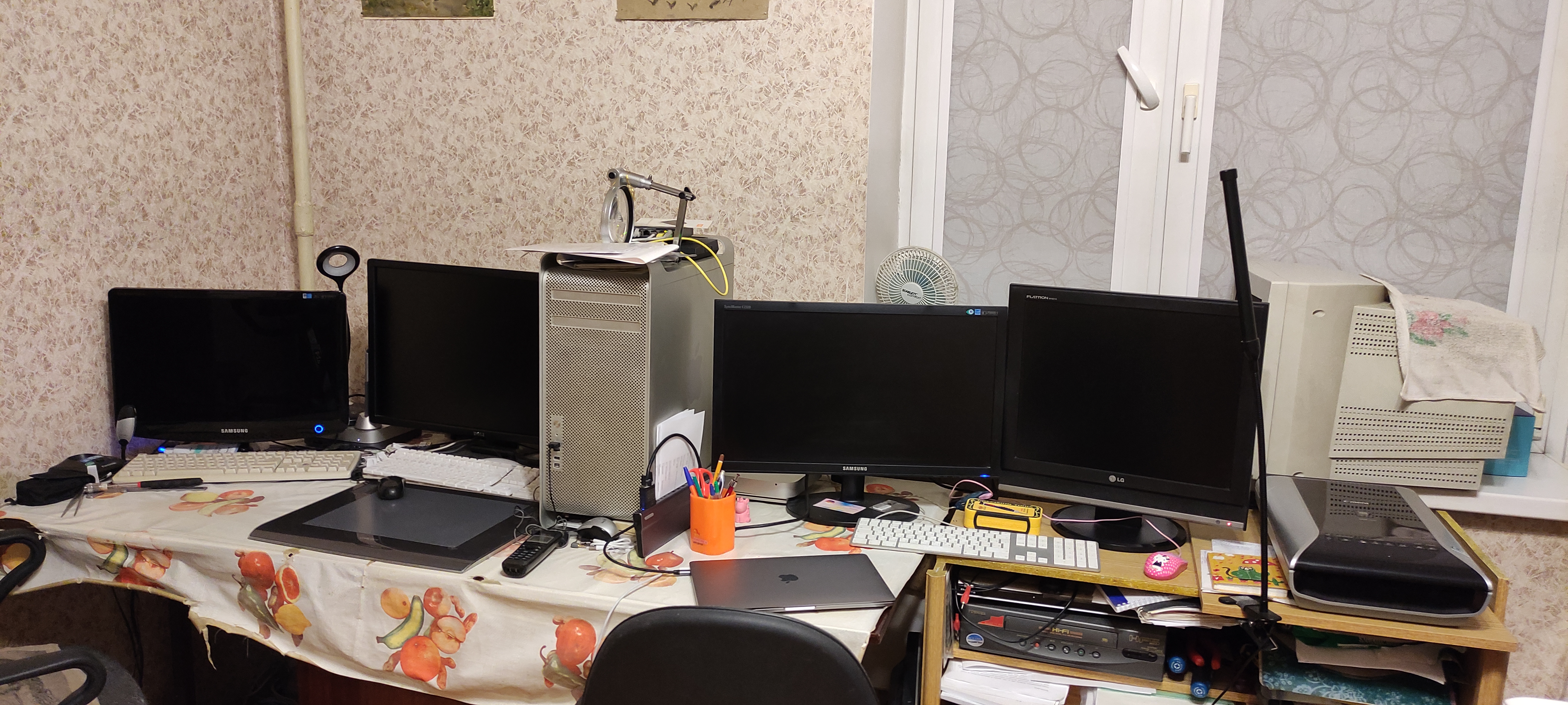 - а ещё домашний комп полключен к большому телику на другой стене; хдми-свич торчит за мини-десктопом на стене