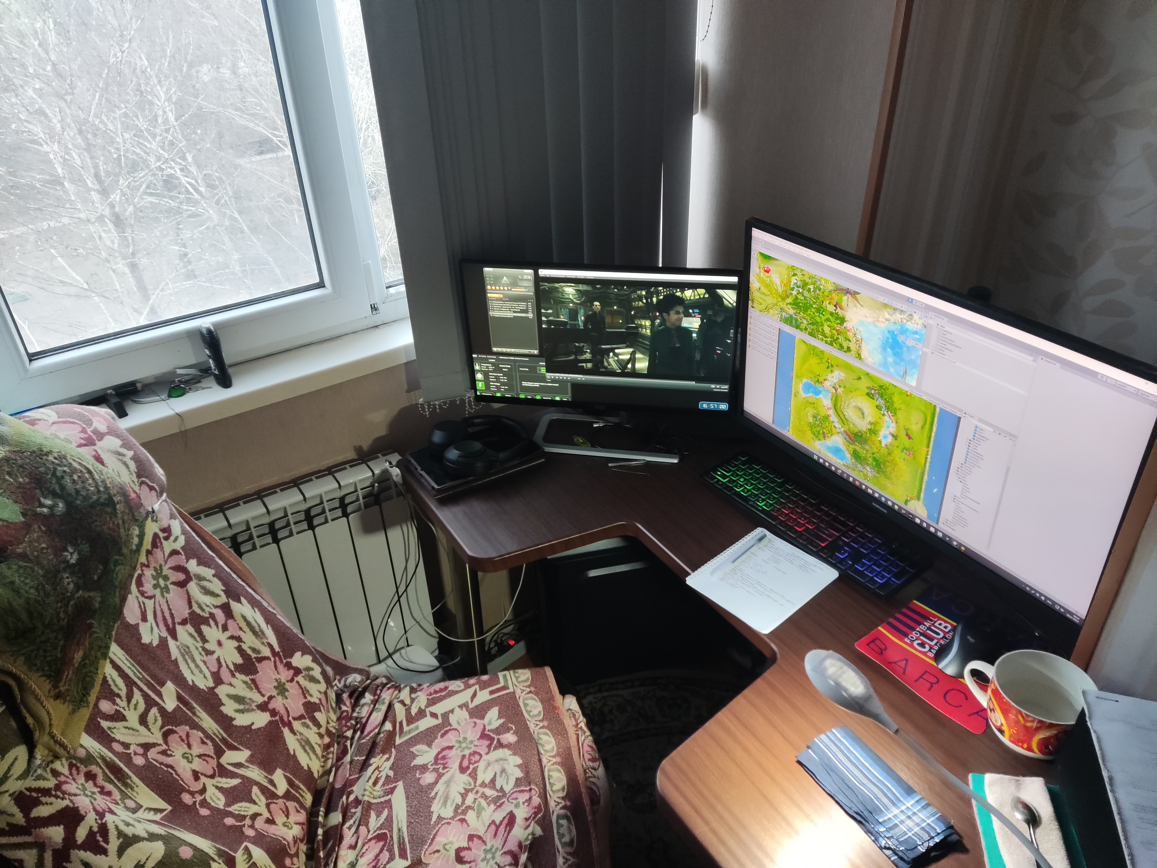 Кстати, на мониторе видна одна из вкладок "Home assistant" с планом моей квартиры, при помощи которого я могу управлять с рабочего места всей остальной квартирой (у меня более 200 умных устройств в доме, управлять могу почти всем)