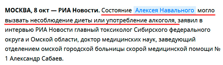 Я, собственно, не про эти идиотские заявления из серии "впал в кому, потому что не позавтракал": хотят эти люди прилюдно позориться, ну пусть и позорятся, их проблемы. Я про то, как написана сама новость на "РИА". То есть состояние Навального взяло да и вызвало несоблюдение диеты. Или вызвало употребление алкоголя. Вот какое у него интересное состояние-то. Интересно, сегодня мое состояние вызовет употребление алкоголя? Вполне возможно, кстати, прям состояние из серии: "А не выпить ли нам"?!!