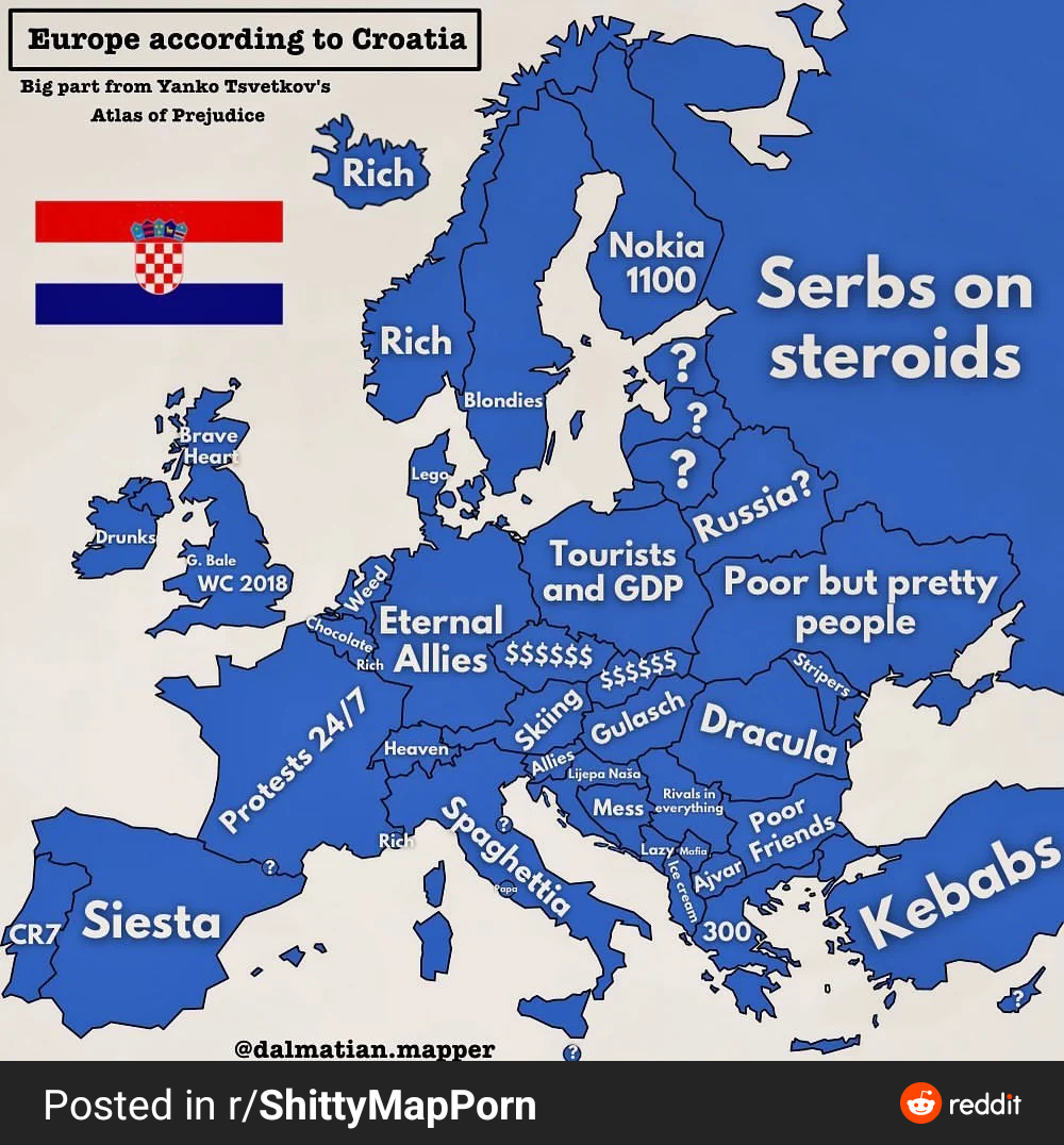 За исключением нюансов ("хорошие" отношения с cербами), процентов на 75 такую же карту можно нарисовать для любой восточно-европейской нации 😄.