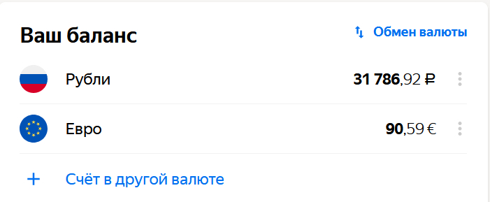 А теперь обычную рублевую карту ЯД можно сделать мультивалютной. Прям в кошельке. Заводите счет в другой валюте (10 валют поддерживаются). Обмениваете на нее рубли.