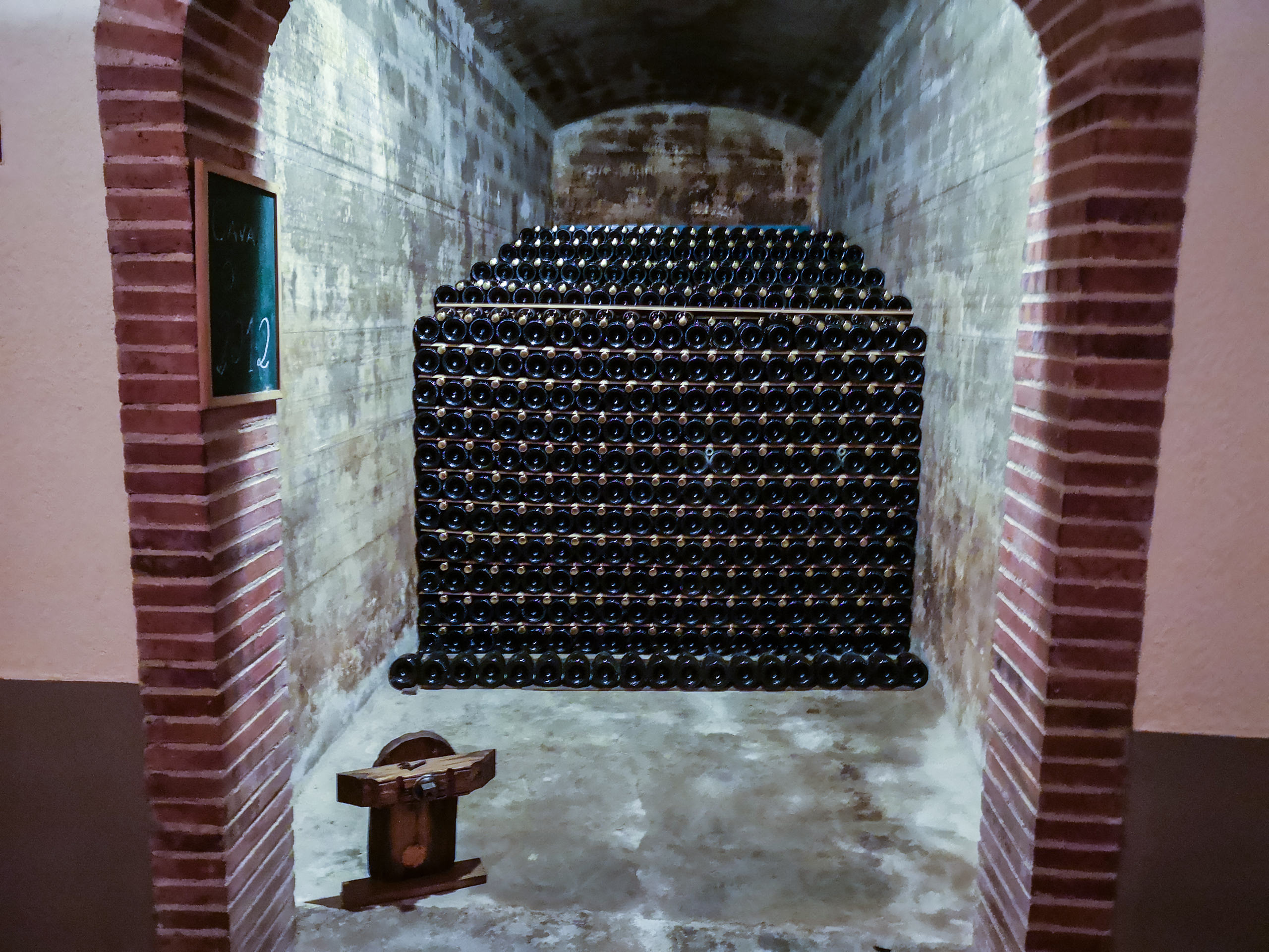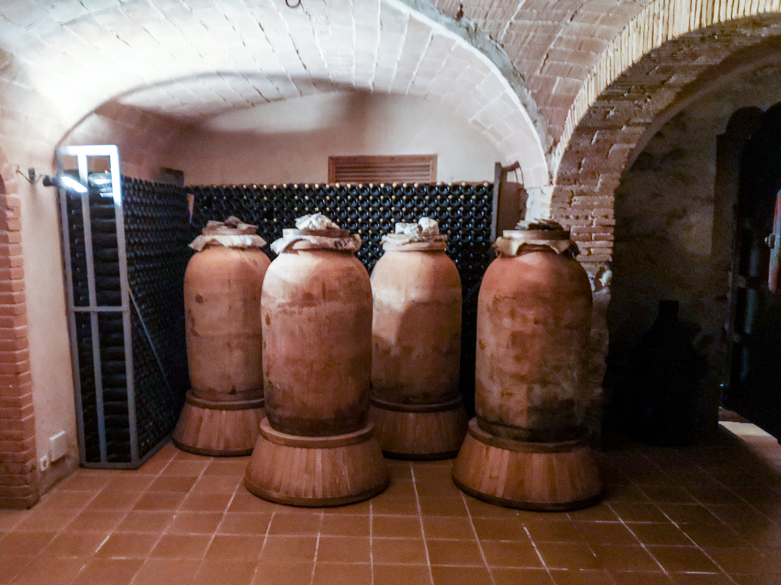 Глиняные сосуды для вина. Что интересно, сзади там лежат бутылки с Gran Reserva, которым лет пятнадцать-двадцать. И к ним также доступ совершенно свободный.