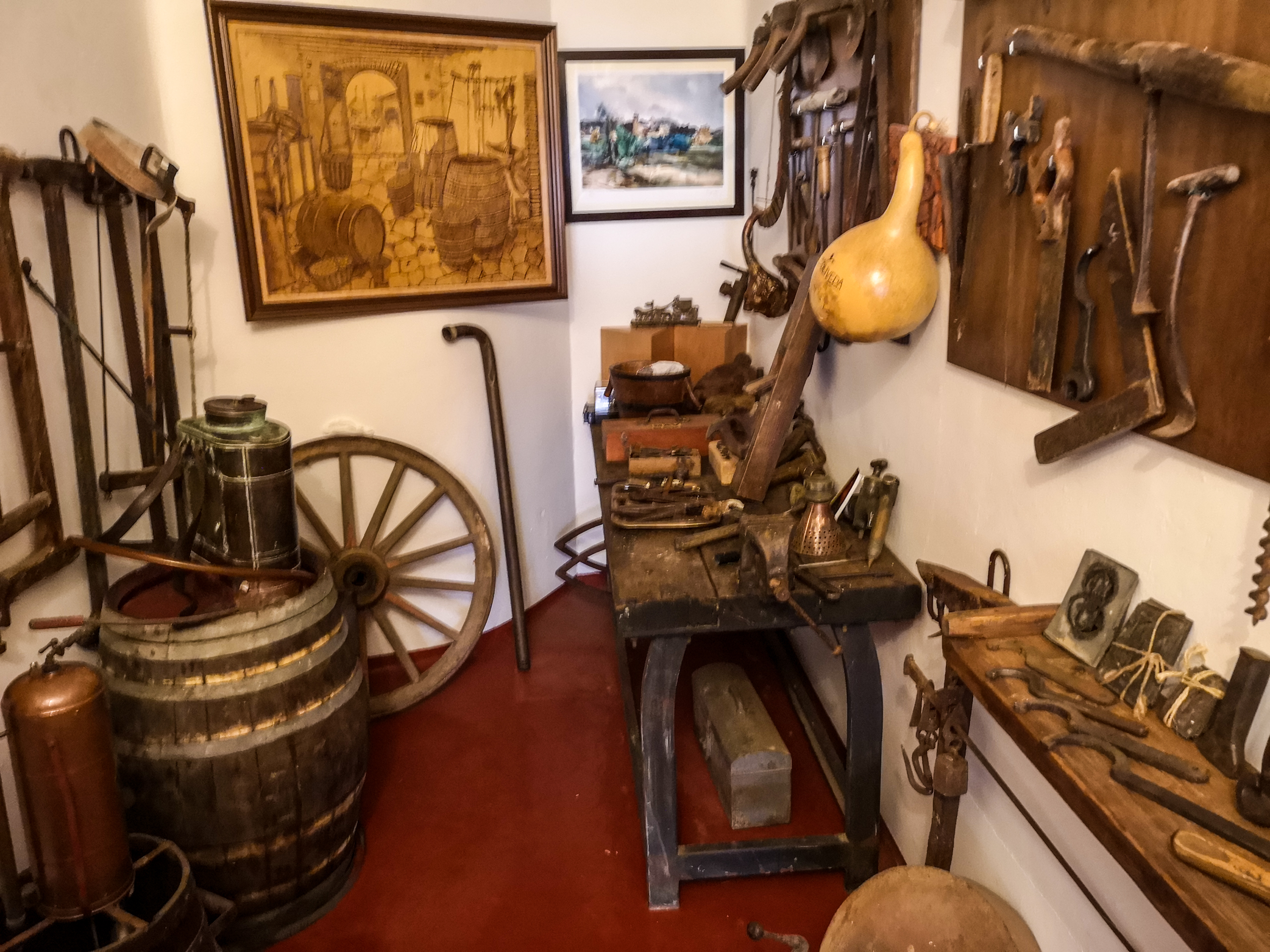 Небольшая комнатушка с утварью бондарей - мастеров, которые делают бочки для вина.
