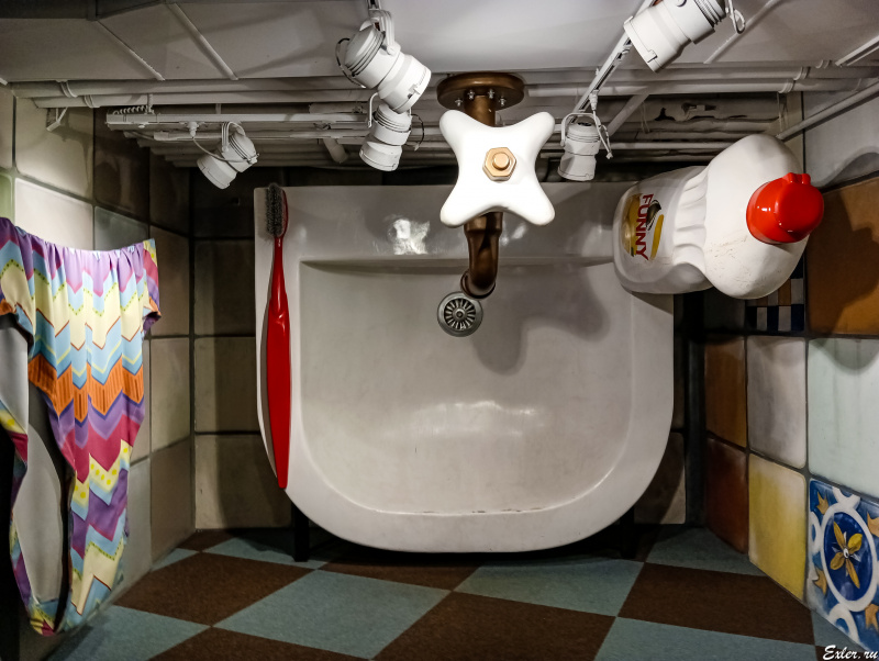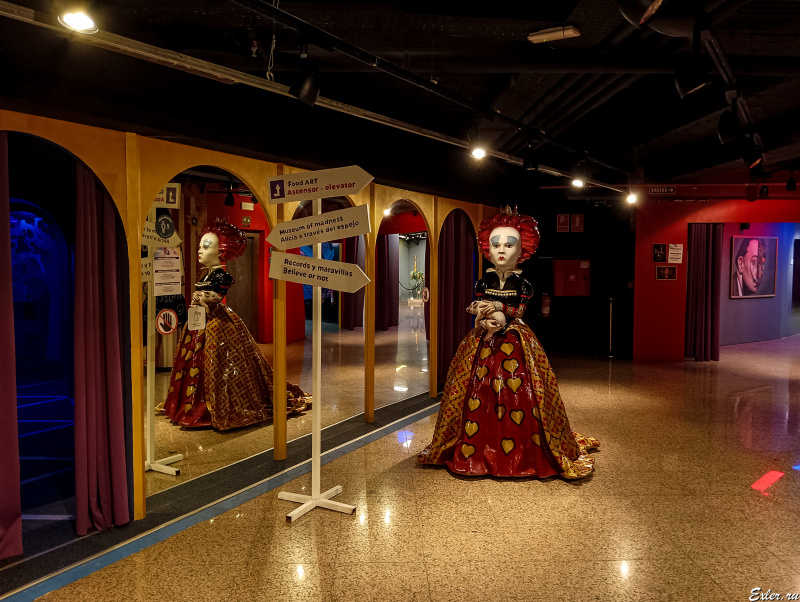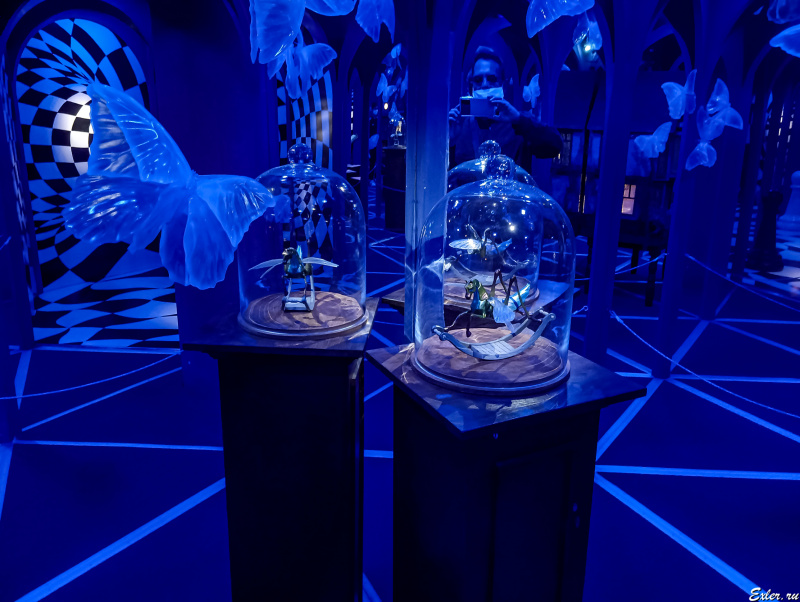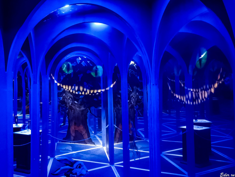 Осмотр экспозиции начинается с очень интересного зала, посвященного "Алисе в стране чудес". Там главная фишка - система зеркал, располагающихся под углами в 45 и 90 градусов, которые создают совершенно иллюзорный мир, в котором ты не понимаешь, где реальные предметы (а также где реальные люди), а где их отражения. Выглядит это очень и очень впечатляюще. Но фотографировать не было смысла, фотографии толком ничего не передают.
