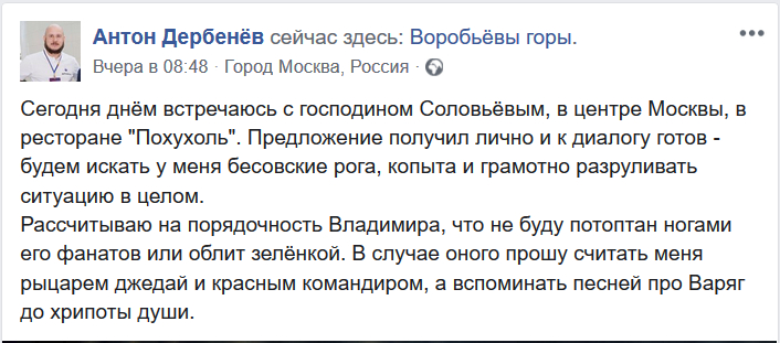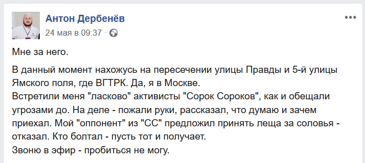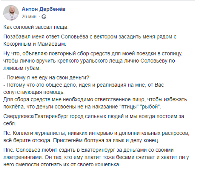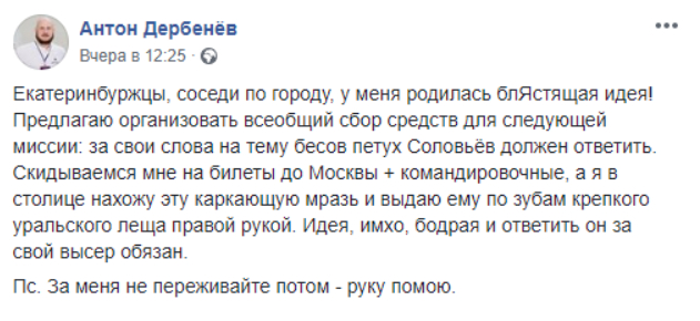 В ответ на это журналист из Екатеринбурга Антон Дербенев в своем Facebook начал собирать средства для полета в Москву, чтобы, по его словамм, найти эту каркающую мразь и выдать ему по зубам крепкого уральского леща правой рукой. Ибо Вова, по словам Антона, обязан ответить на свой высер. (Эта запись у него из FB уже удалена, но Google все помнит.)