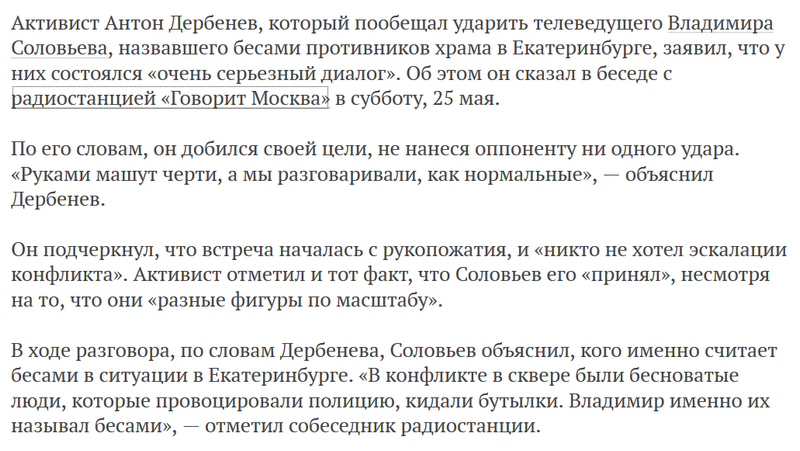 "Меня совершенно не интересует реакция бесноватых. У нас уже есть такие любители от Мамаева до Кокорина, которые сидят. Ведь он хочет дать кому-то леща? У них там есть академия боевых искусств как раз в Екатеринбурге, откуда вышли люди, разгонявшие бесов, которые, подняв руки, говорили "Мы за храм". Зачем ему так далеко ехать? Он не хочет к ним подойти, выяснить, что и как?" (из интервью изданию "Инфореактор").