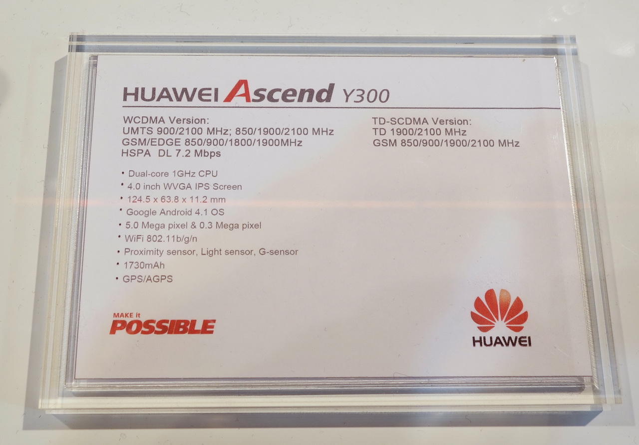 Еще один смартфон - Ascend Y300. Совсем бюджетный вариант - должен стоить порядка $150. Четырехдюймовый IPS-дисплей, двухъядерный процессор, неплохая батарея. Камера 3 Мп. Кстати, камера запускается и снимает не слишком шустро. Точнее, слишком не шустро. Но как бюджетный вариант - очень интересен.