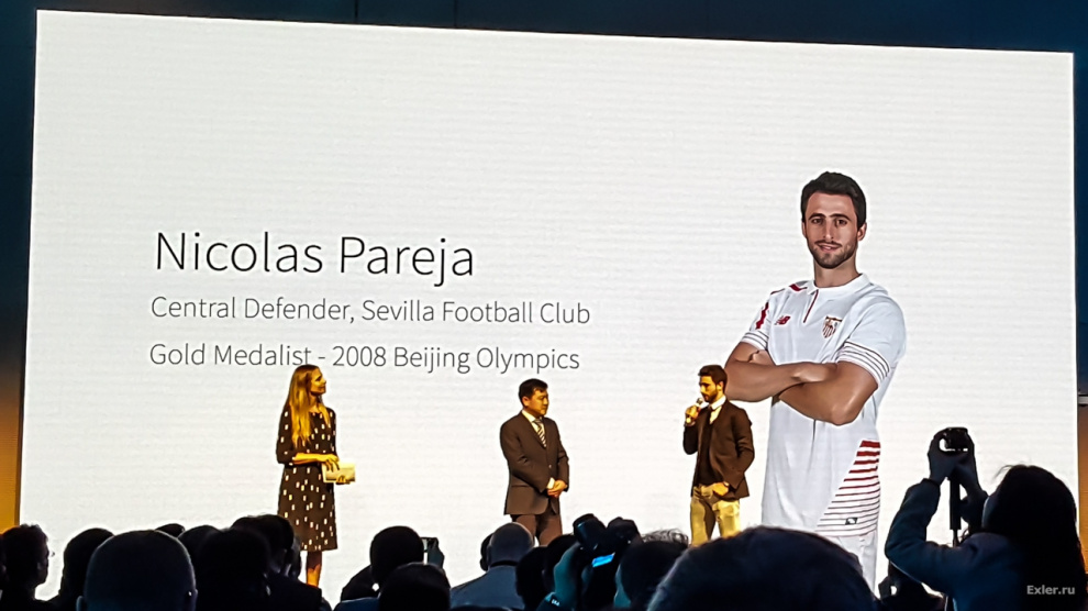 После этого на сцену пригласили футболиста Николаса Пареху из Севильи, который сказал, что он очень возбужден тем фактом, что он пытается говорить на английском, и что за этой штукой - будущее, он в этом уверен. И что он этот проектор обязательно будет использовать в своих тренировках, для отдыха или для засолки капусты.