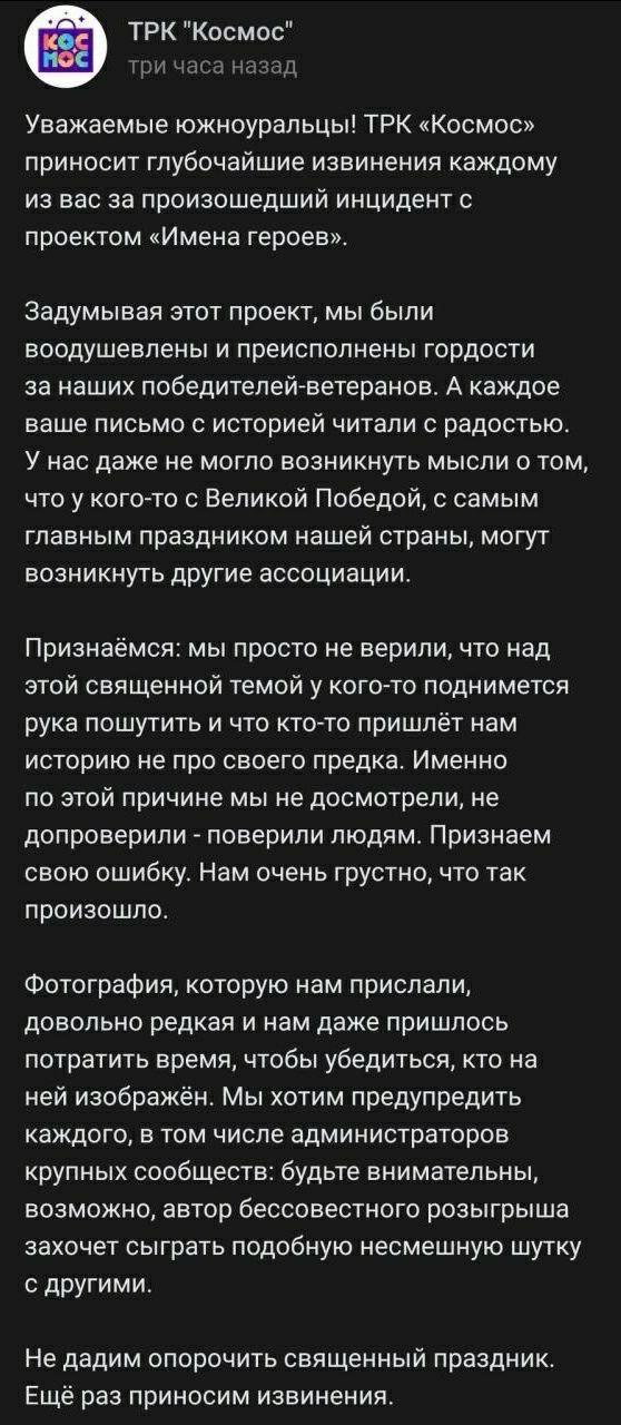 Вот тоже так подумал. Люди из этого ТРЦ в своей группе объявили конкурс с фотографиями воевавших родственников, кто-то решил постебаться и прислал фото Гитлера. Мне кажется их вина тут не очевидна, не каждый может сходу определить, что это Гитлер, тем более, что без усов. Да и люди, внешне похожие на Гитлера были и есть. До войны кстати многие носили такие усики и Адольф было популярным именем. И их реакция более, чем корректна.
