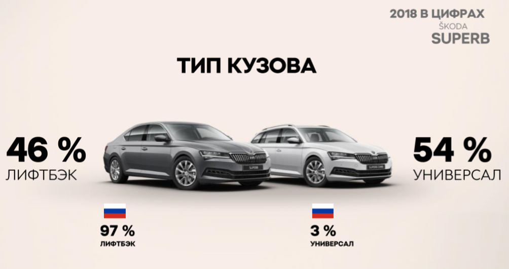 Соотношение типов кузовов SUPERB в России. Оказывается, универсал даже более популярен.