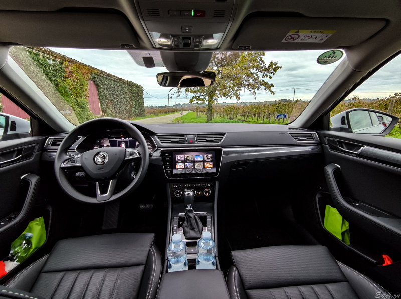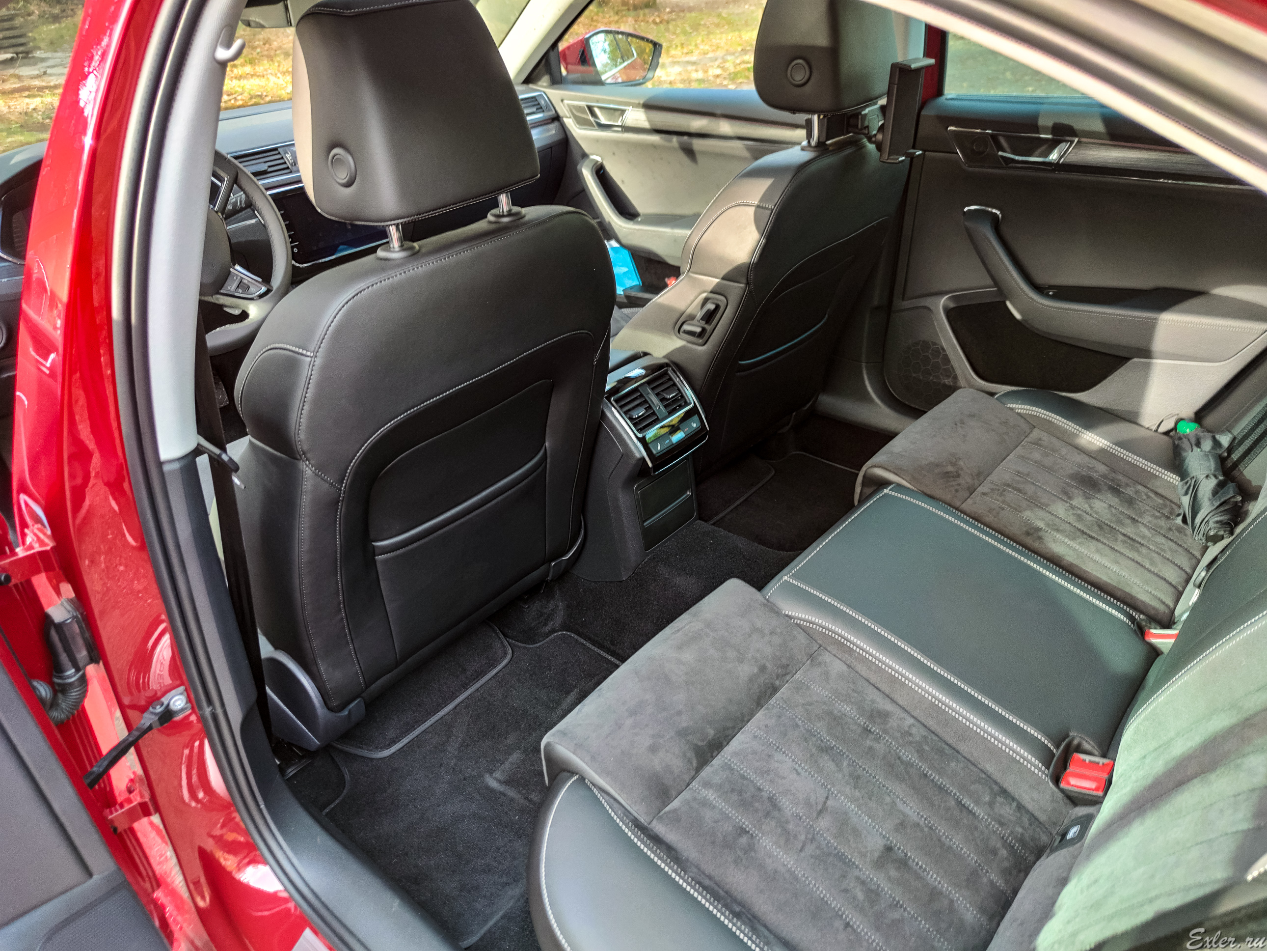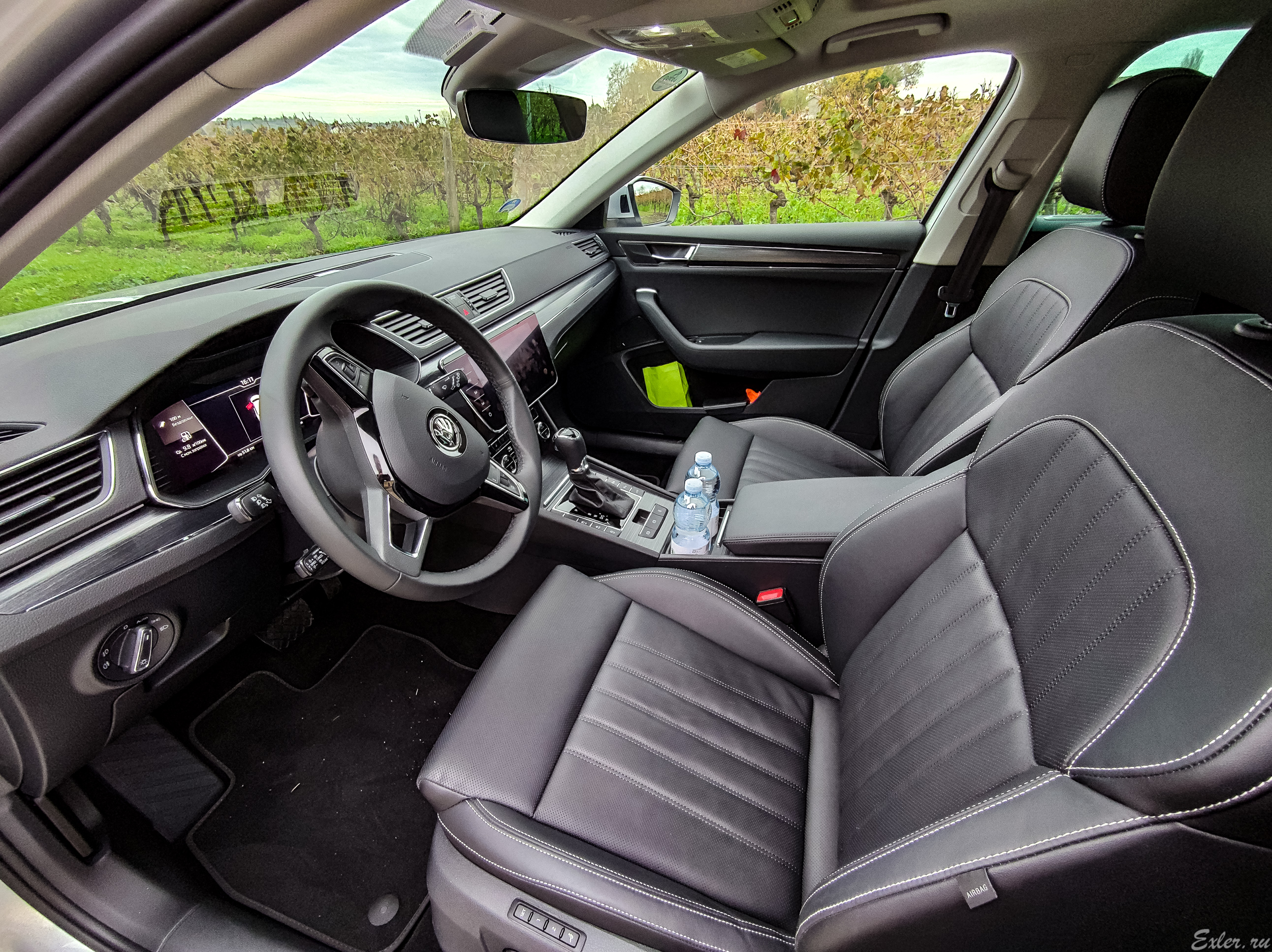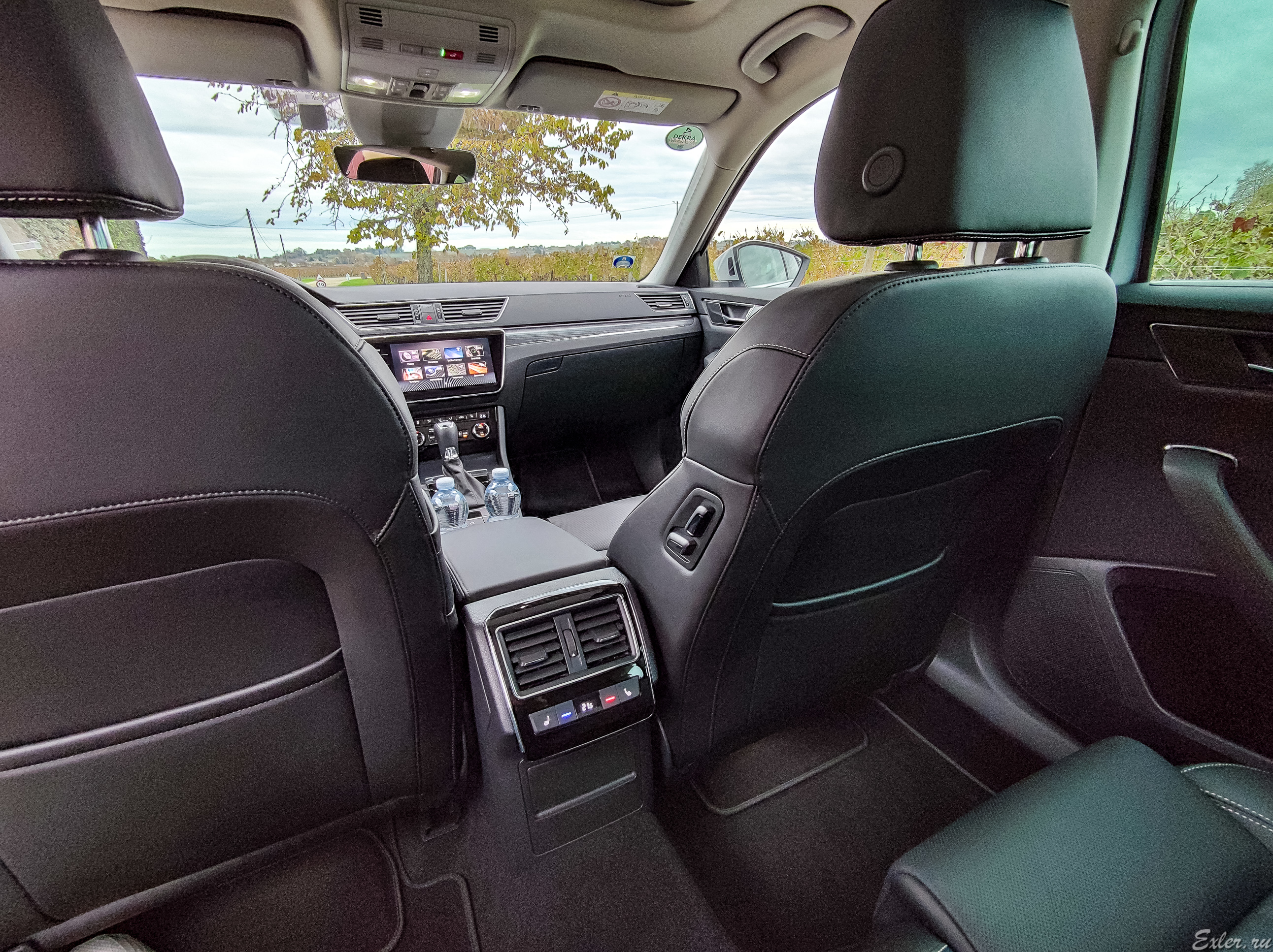 Кресла SUPERB могут быть обиты материалом Alcantara, кожей или тканью. Их можно снабдить системой вентиляции и подогрева, а для кресла водителя также можно установить функцию массажа. (В наших машинах такого не было, а жаль, интересно было бы посмотреть, как оно работает.)