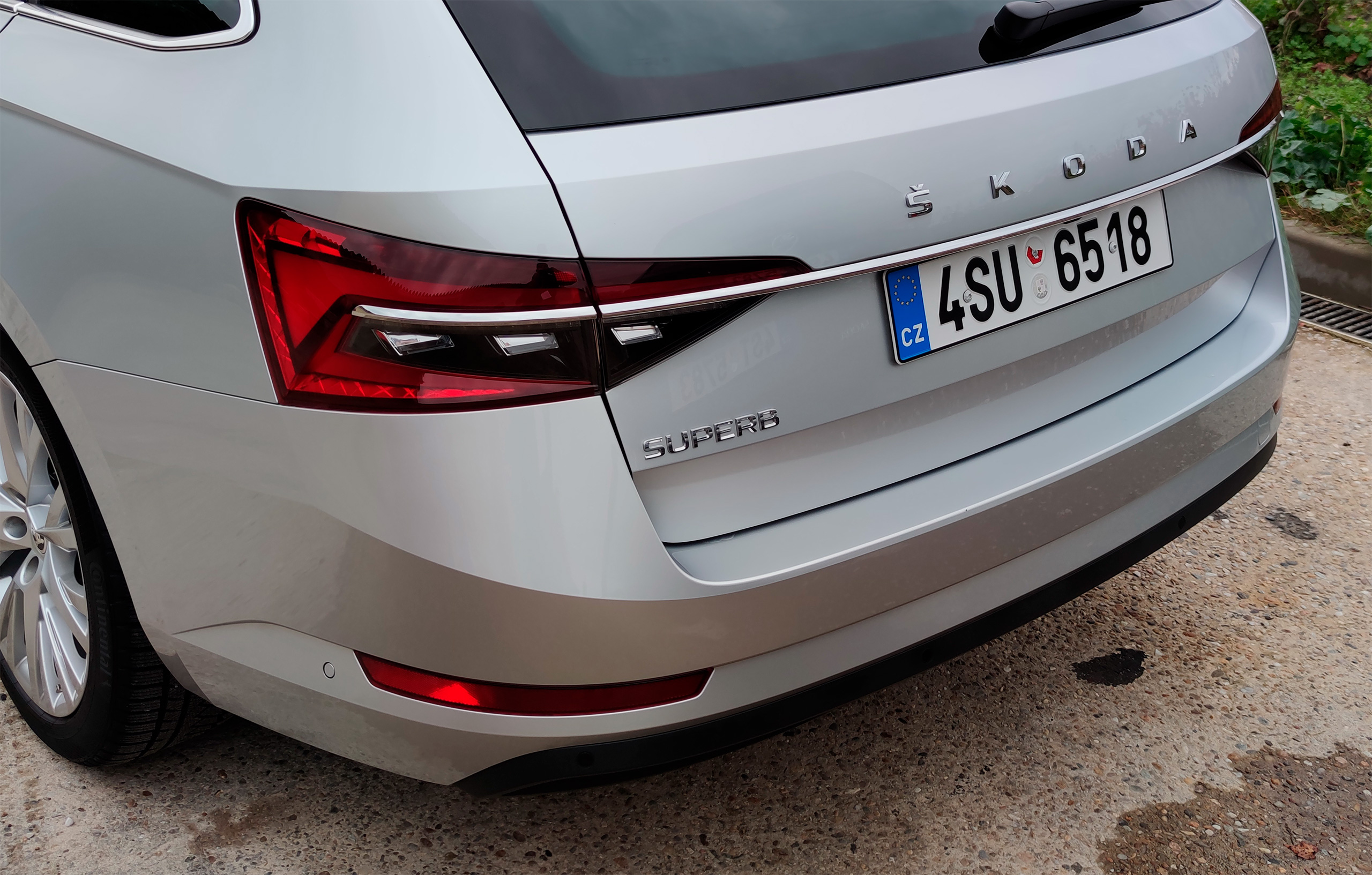 На задней части вместо логотипа бренда теперь надпись ŠKODA. Задние фонари - полностью светодиодные, через них теперь проходит хромированная полоска, которая визуально их соединяет.