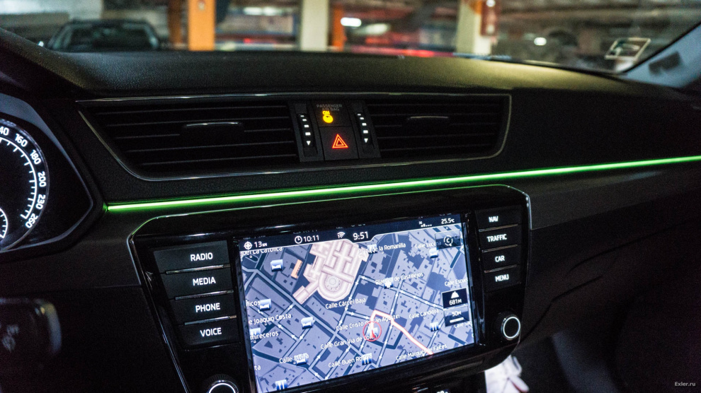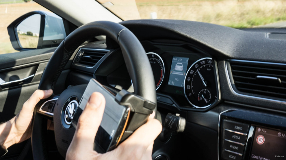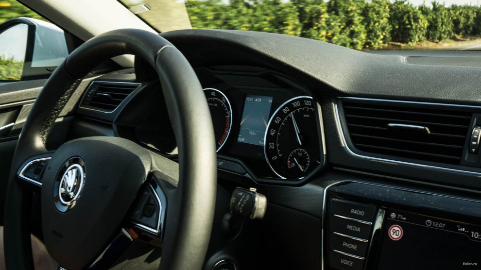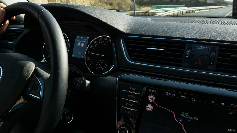 Ну и поехали. Работает это все очень интересно: система четко выдерживает расстояние до автомобиля, самостоятельно регулируя разгон и торможение (нам сначала было страшновато при подъездах к светофорам, но все работало очень четко). Если ведущая машина сворачивает или просто уходит с полосы, Superb, разумеется, перестает за ней следовать и просто ищет очередной ведущий автомобиль на нашей полосе.
